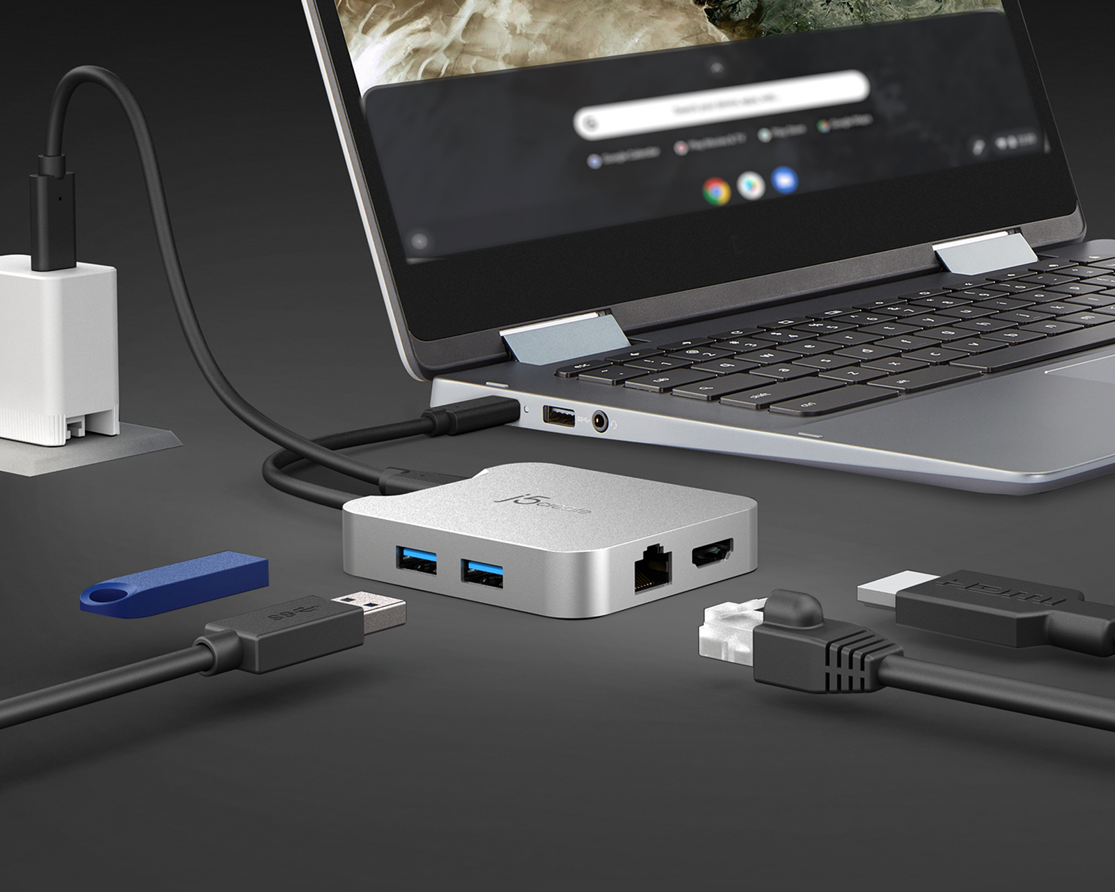 Denne kompakte multiport-adapter fra j5create har det væsentlige til dig, der ofte er på farten og har brug for at få arbejdet udført uden for kontoret eller hjemmet. Adapteren har HDMI-port, RJ45 Gigabit Ethernet-port, to USB Type-A-porte (5Gbps) og USB-C Power delivery 3.0 til at oplade din enhed på samme tid. Den er kompatibel med Chromebooks, MacBooks og andre USB-C bærbare computere og kan endda tilsluttes en 4K-skærm eller tv for at udsende 60Hz og lyd.- Maks. dataoverførselshastighed: 5 Gbps