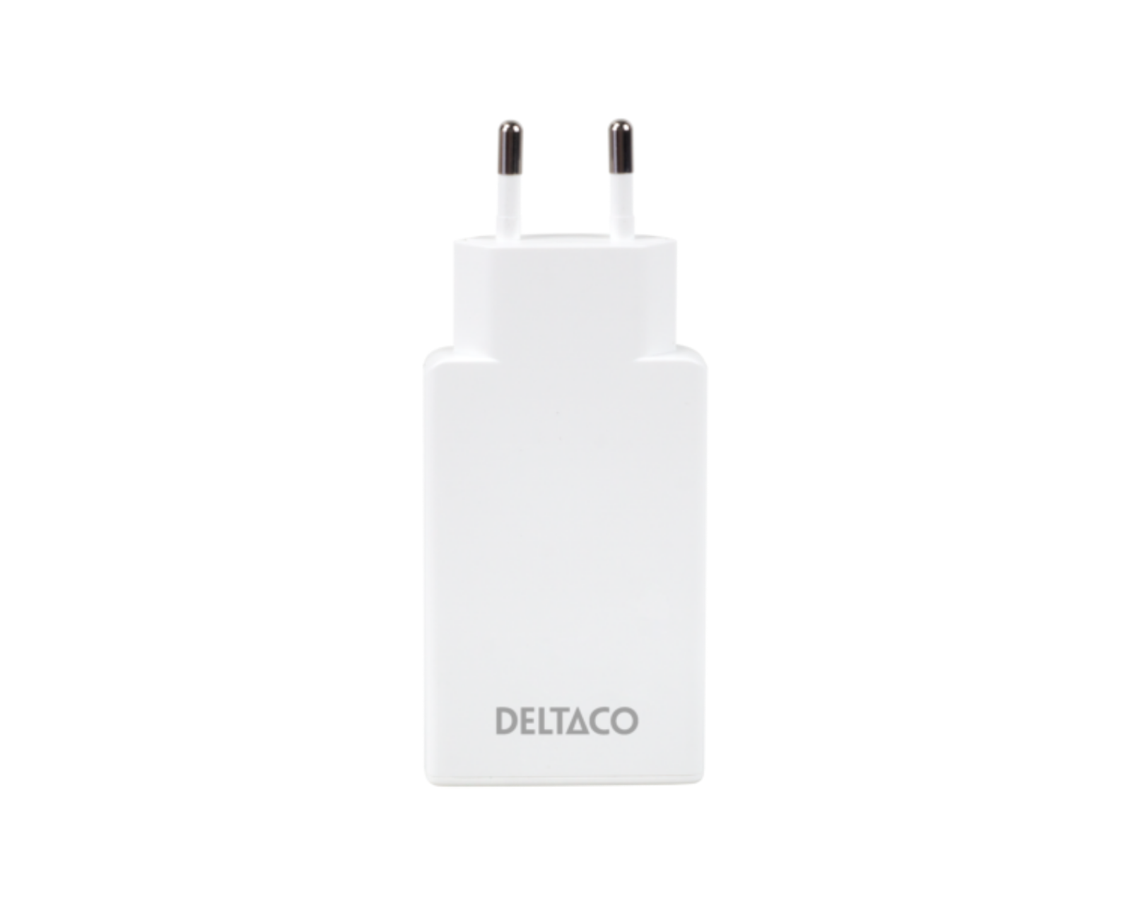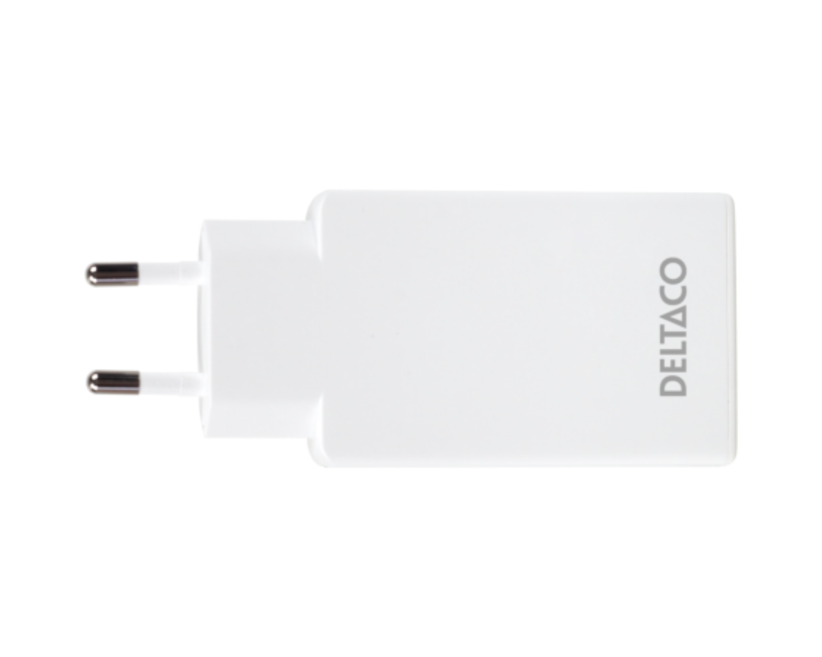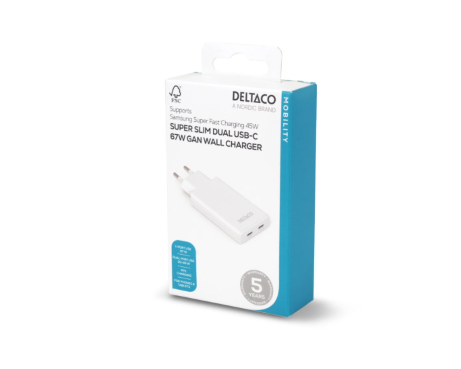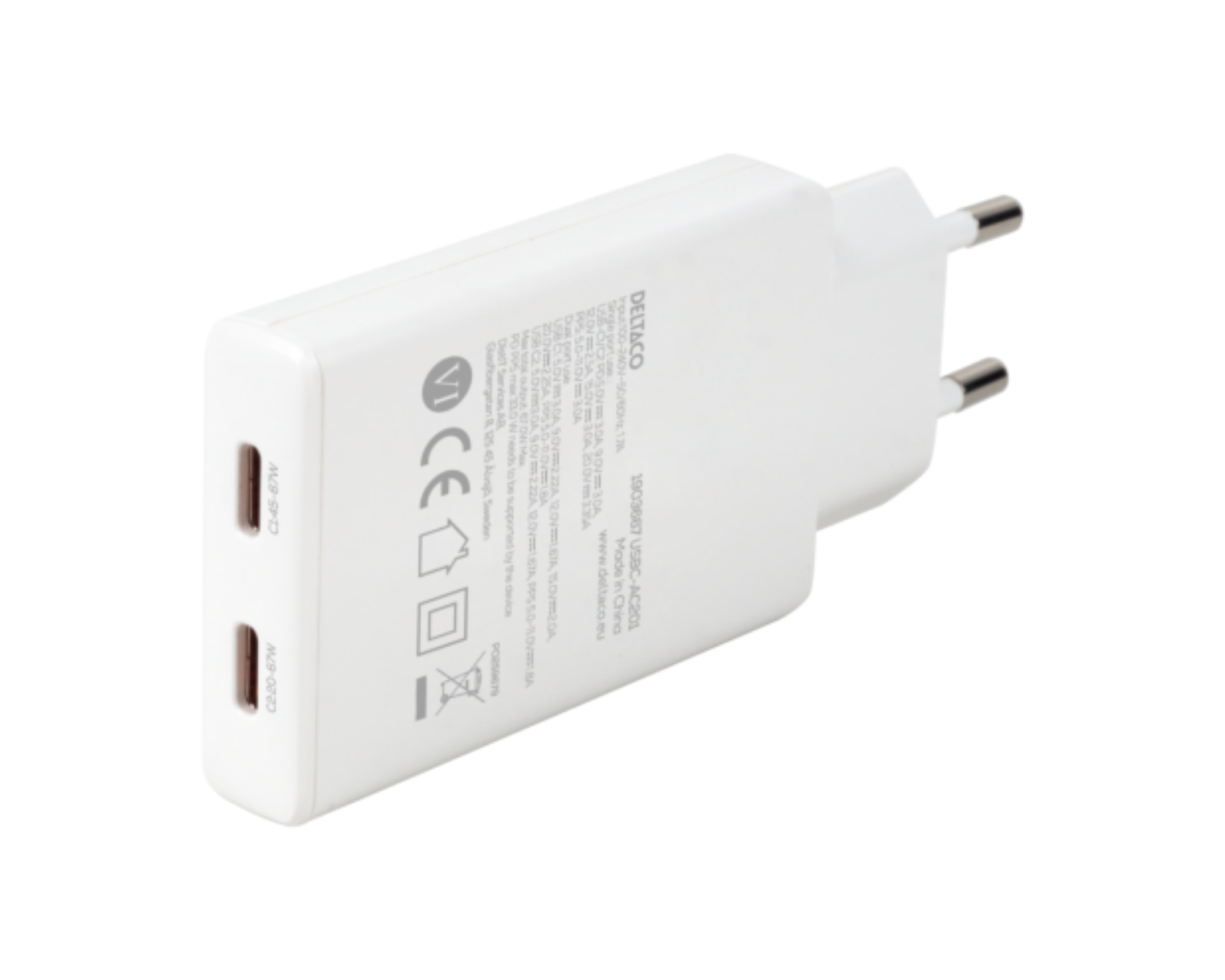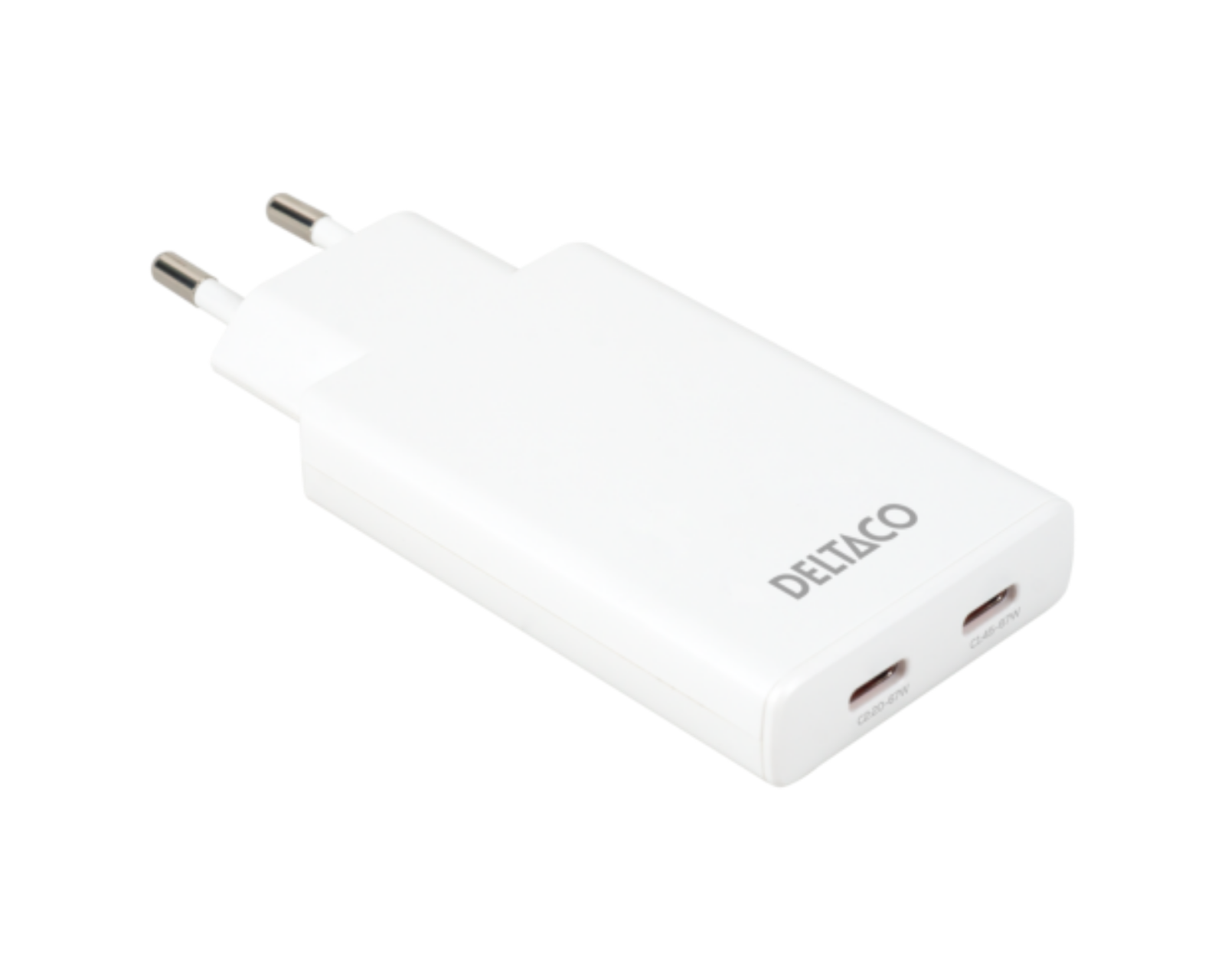 67W 2x USB-C væglader er en væglader fra Deltaco, som tilbyder hurtig og effektiv opladning med en total effekt på 67 W. Den er udstyret med to USB-C PD-porte, hvilket gør den velegnet til opladning af telefoner, tablets og bærbare computere. Portene kan bruges individuelt eller sammen, hvilket muliggør fleksibilitet i opladningsmulighederne.Laderen understøtter PPS-opladning, som optimerer strøm og spænding i realtid afhængigt af enhedens opladningsstatus. Når en port bruges, kan den give op til 67 W, og når begge porte bruges, er maksimumseffekten 45 W for port C1 og 20 W for port C2. Laderens slanke design gør den perfekt til rejser, og den kræver, at enheden, som oplades, understøtter PPS for optimale resultater.