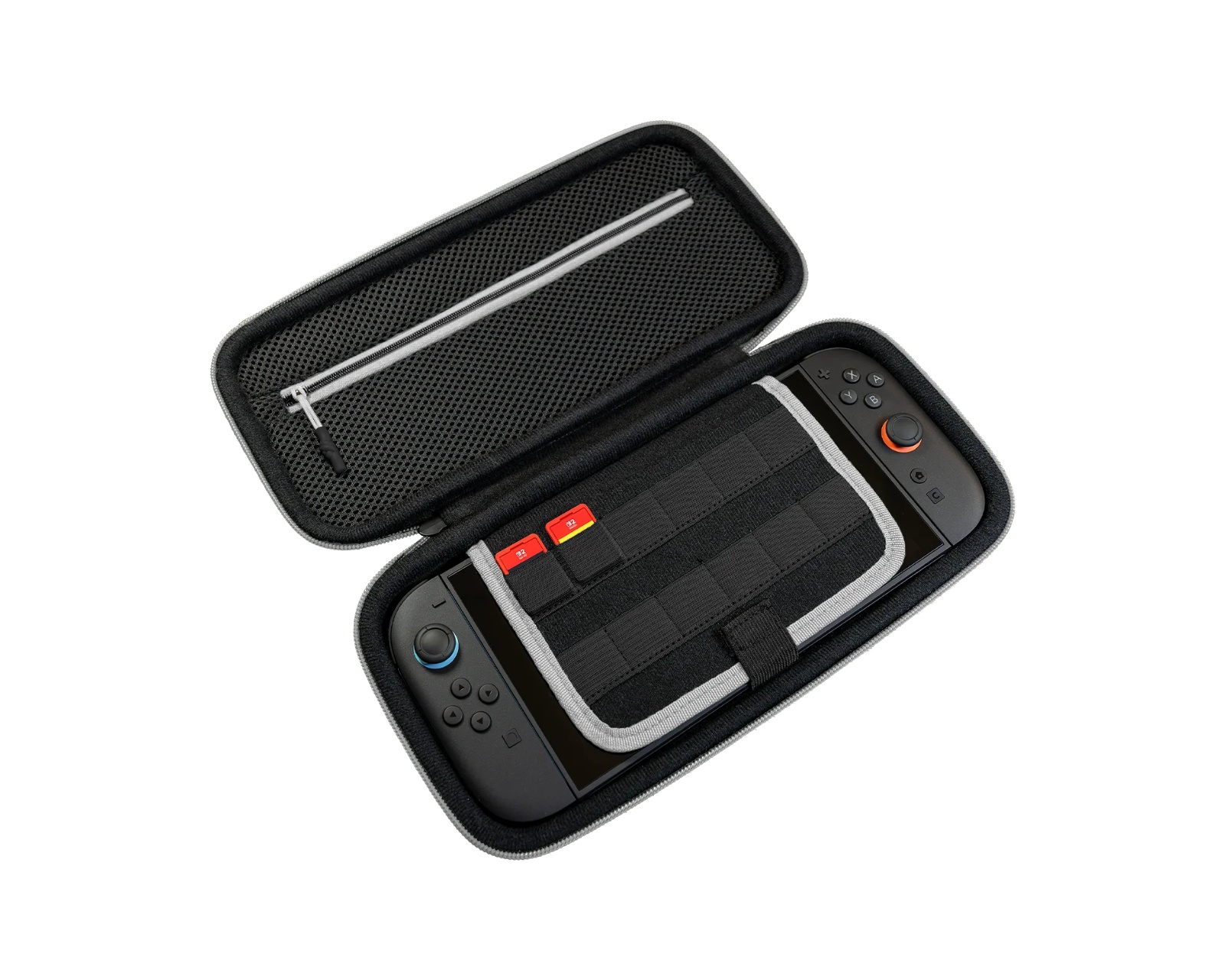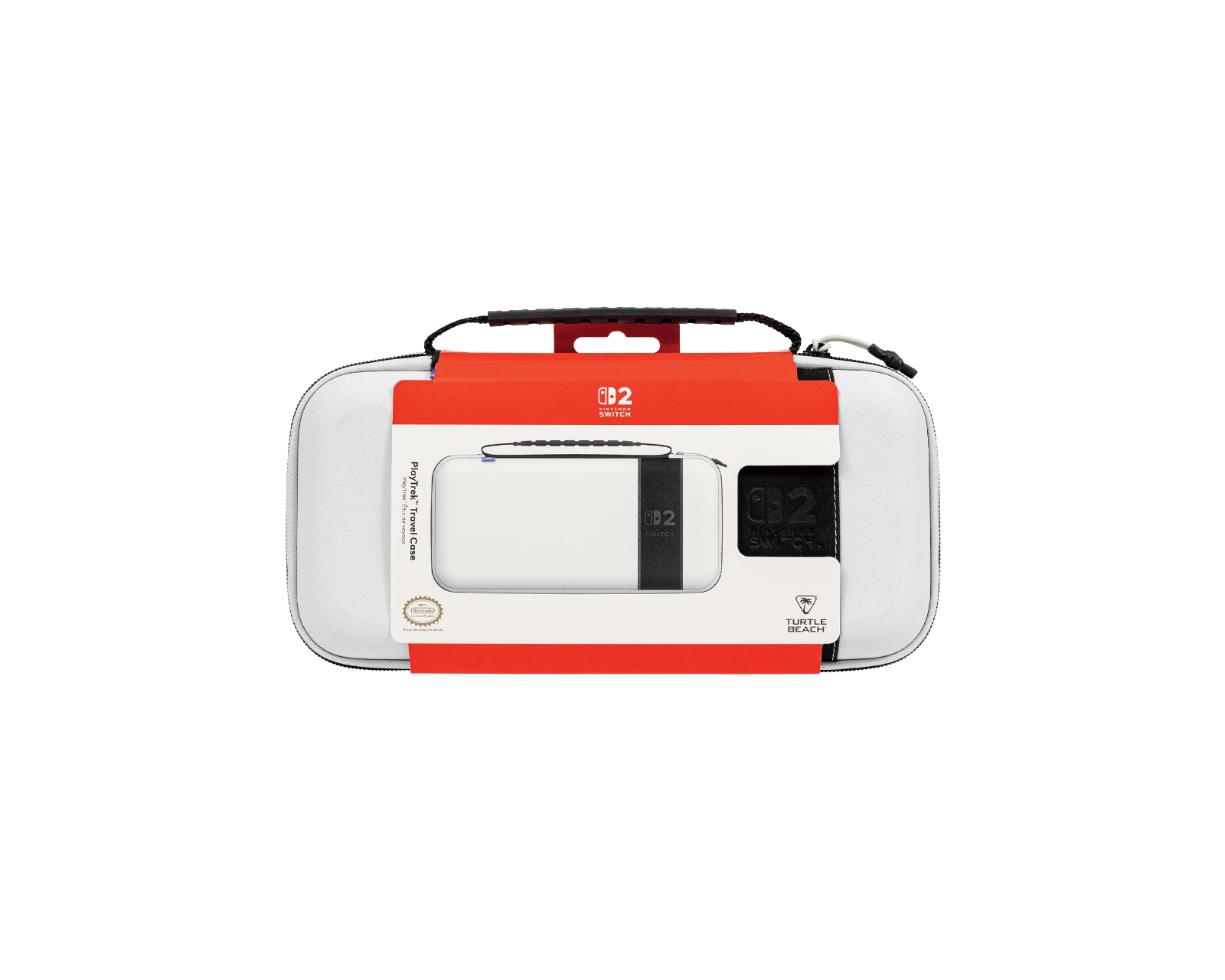 PlayTrek Rejsetaske er en bærbar taske fra Turtle Beach, designet til at beskytte Nintendo Switch™ 2, Nintendo Switch™ og Nintendo Switch™ - OLED Model. Taskens design kombinerer funktionalitet med holdbarhed for at sikre, at konsollen er beskyttet under rejser. Med en vægt på 0,83 lbs (378 g) og mål på 11,81” x 6,10” x 2,28” (300 mm x 155 mm x 58 mm) er det en kompakt løsning for spillere på farten.Tasken har en struktureret EVA-moldet skal, der er dækket med TPU-belagte polyester, hvilket bidrager til et højt niveau af stød- og slidstyrke. Det polstrede indre rum beskytter skærmen mod ridser, mens en indbygget netlomme tilbyder opbevaring til mindre tilbehør som kabler eller ørepropper. Dedikerede kortpladser sikrer, at spillekort holdes organiseret. Et forstærket håndtag giver et komfortabelt greb for nem bæring.