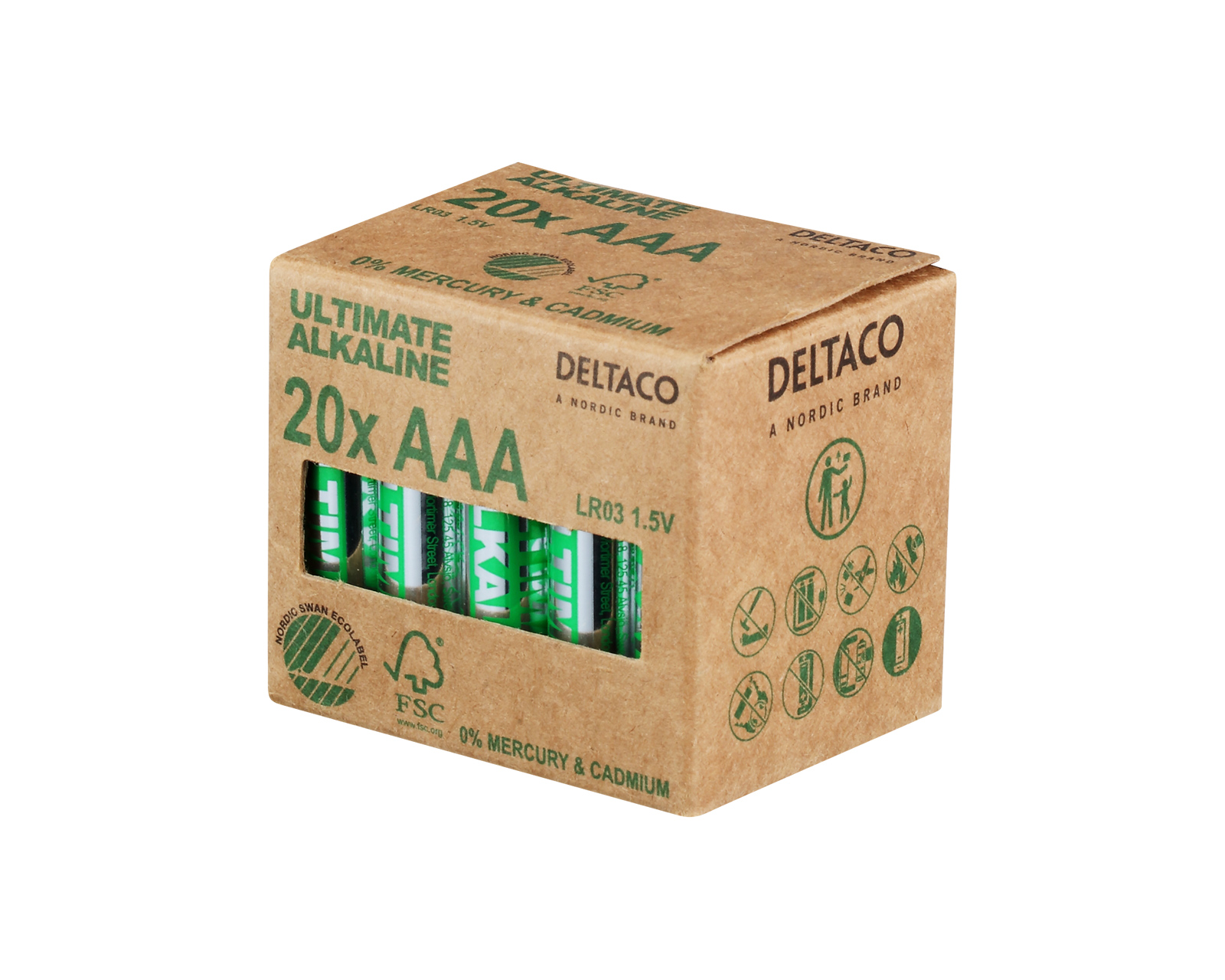Bliv grøn med Ultimate Alkaline AAA-batterier fra Deltaco! Disse svanemærkede batterier er perfekte til dine batteridrevne lommelygter, kontroller og køkkentilbehør og mere. De har en lang holdbarhed og er klar til brug, når du har mest brug for dem. Med indbygget lækagebeskyttelse er disse batterier fremragende til lavt til medium kontinuerligt strømforbrug. Derudover indeholder de 0 % kviksølv, bly og cadmium, hvilket giver mindre miljøbelastning. Derudover kommer batterierne i FSC-emballage, der er bedre for miljøet.Vælg Ultimate Alkaline batterier fra Deltaco for et mere ansvarligt køb for både dig selv og miljøet.