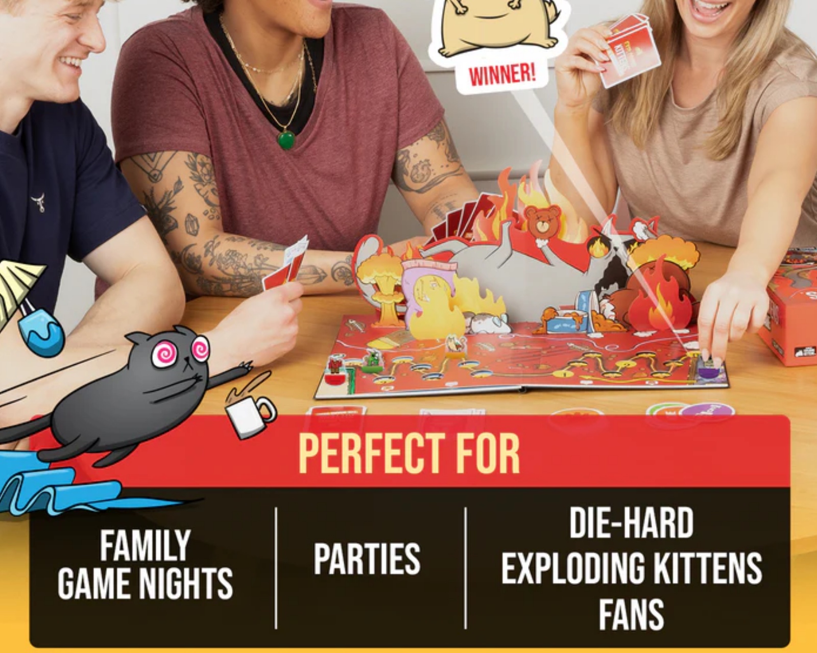 Exploding Kittens: Brætspillet - Super Fan Edition er et brætspil, der kombinerer strategi og held. Spillet indeholder specialkort, et interaktivt spillebræt og unikke karakterer, hvilket giver en ny dimension til den kendte kortversion. Målgruppen inkluderer både nye spillere og fans af den originale Exploding Kittens-kortbunke.Brætspillet består af 65 Aktionskort, 26 Flyttekort, 2 eksklusive kort, et pop-up spillebræt og 6 deluxe karakterer. Det interaktive bræt kan flips, hvilket afslører et nyt spilkoncept og øger spændingen. Spillet er designet til 2-5 spillere og passer godt til spilaftener, hvor hurtige omgange kræves.