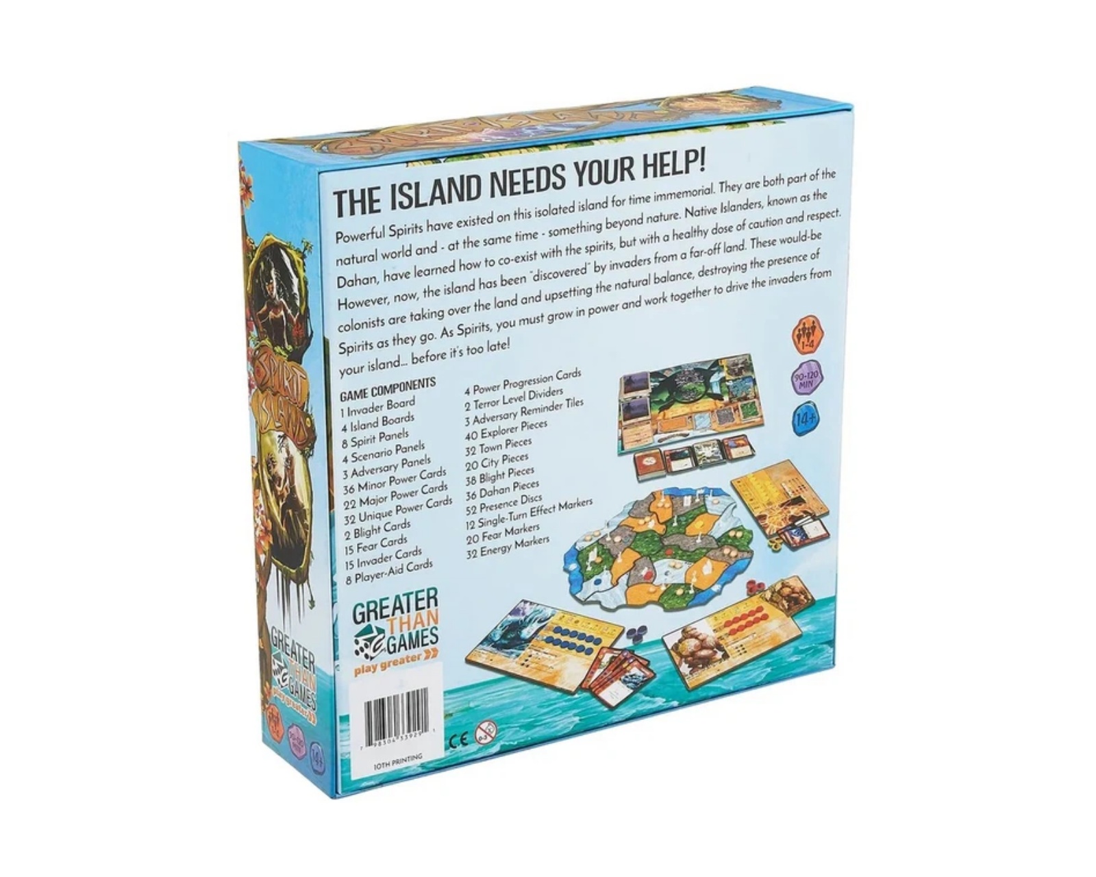 Spirit Island er et kooperativt brætspil, der handler om at forsvare din ø mod koloniserende invaderende angribere. Spillet giver hver spiller mulighed for at kontrollere forskellige ånder af landet, hver med unikke elementære kræfter. Spillerne vælger samtidigt, hvilke kraftkort der skal spilles hver tur, hvor de koster energi. Ved at kombinere kraftkort, der matcher en ånds elementære affiniteter, kan spillerne opnå bonusfærdigheder. Hurtige kræfter udføres straks, inden de invaderende angribere når at sprede sig, mens andre magier kræver mere planlægning. I åndefasen får ånderne energi og vælger, hvordan de vokser, enten ved at genvinde brugte kraftkort, søge ny kraft eller sprede deres tilstedeværelse til nye områder på øen.De invaderende angribere udvider sig på kortet i et delvist forudsigeligt mønster. Hver tur udforsker de forskellige dele af øen, bygger bosættelser og byer og forårsager blight, når de angriber indfødte indbyggere. Ånderne kæmper tilbage mod de invaderende angribere og beskytter øen. Spillets kompleksitet øges over tid og tilbyder forskellige sværhedsgrader, med en række modstandere at bekæmpe.