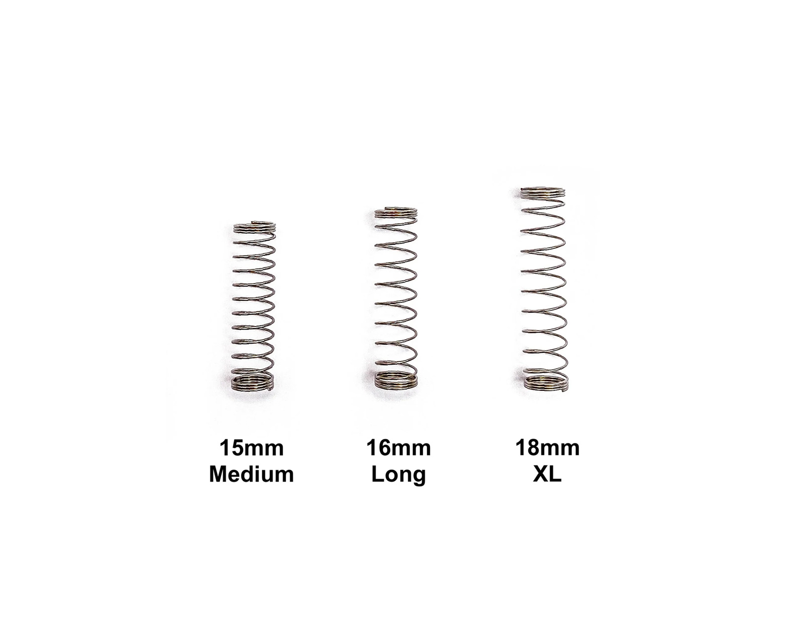 Kommer i tre størrelser: Medium (15 mm), lang (16 mm) og XL (18 mm). Passer til Cherry MX-lignende switche, ikke BOX switche. Jo lavere vægt, jo mindre kraft kræves der for at aktivere kontakten, og jo højere vægt, jo mere kraft kræves der.