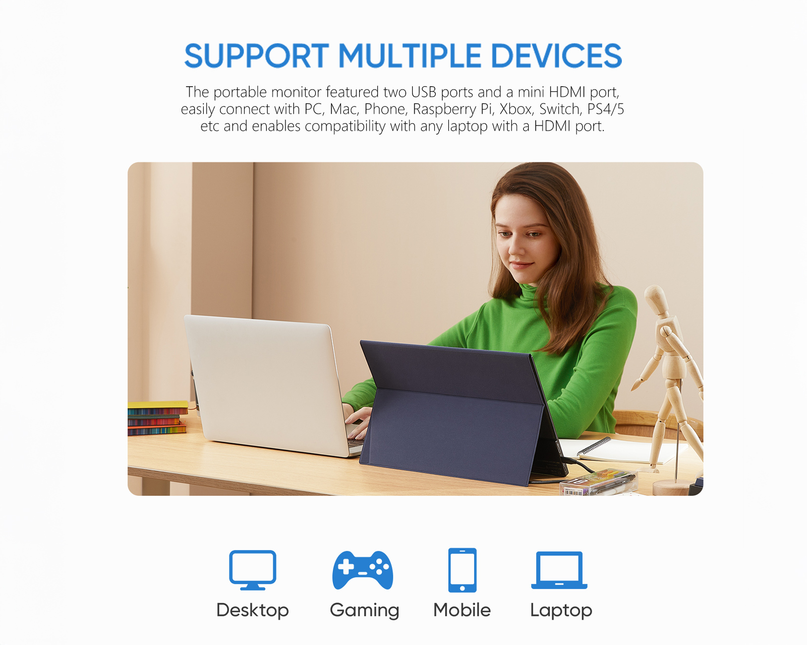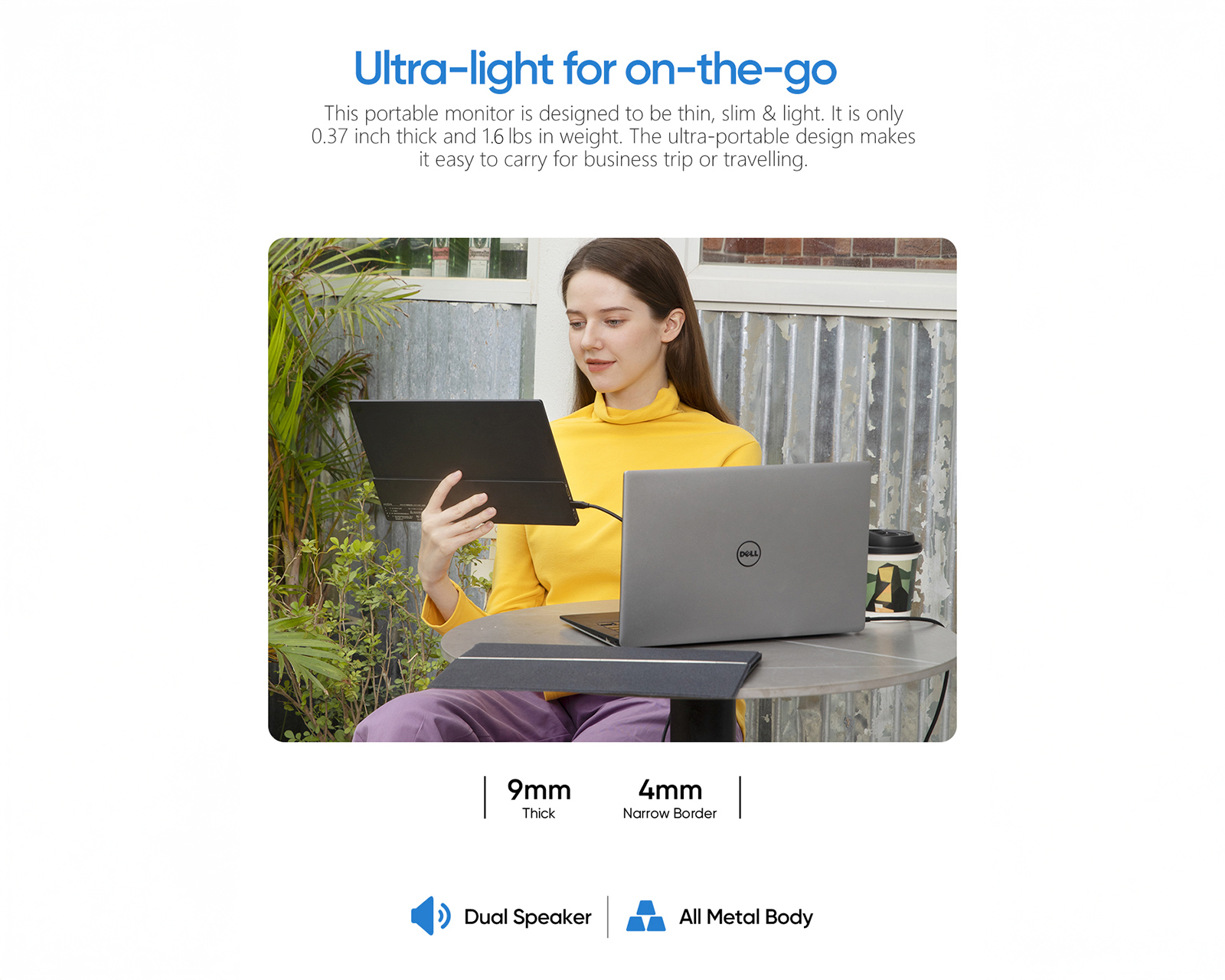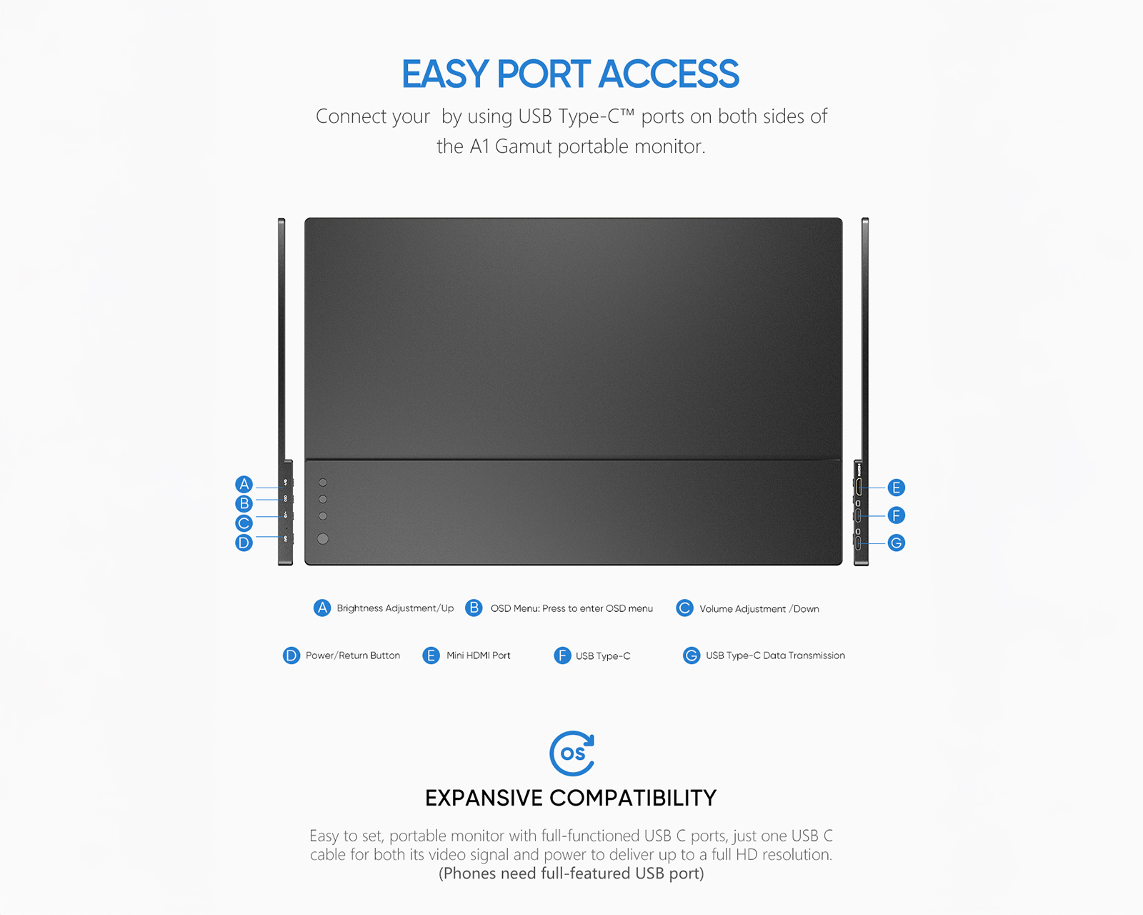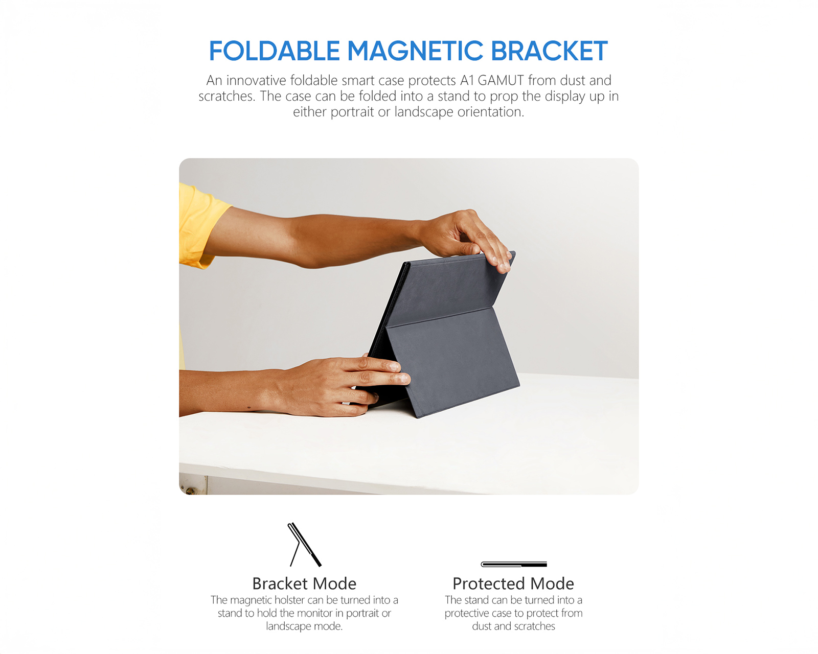 Enheden har en ultratynd profil og en robust bygekvalitet i CNC-anodiseret aluminium, hvilket gør den både slidstærk og let at tage med på rejse. For maksimal fleksibilitet tilsluttes den nemt via USB-C eller Mini-HDMI til bærbare computere, Mac, spilkonsoller (PS5/Xbox/Switch) og udvalgte mobiltelefoner. Lyden leveres via dobbelt indbyggede højttalere, og der er også et 3,5 mm-jackstik til hovedtelefoner. Det medfølgende magnetiske smart-cover beskytter skærmen under transport og fungerer samtidig som et justerbart stativ for optimal visningsvinkel.