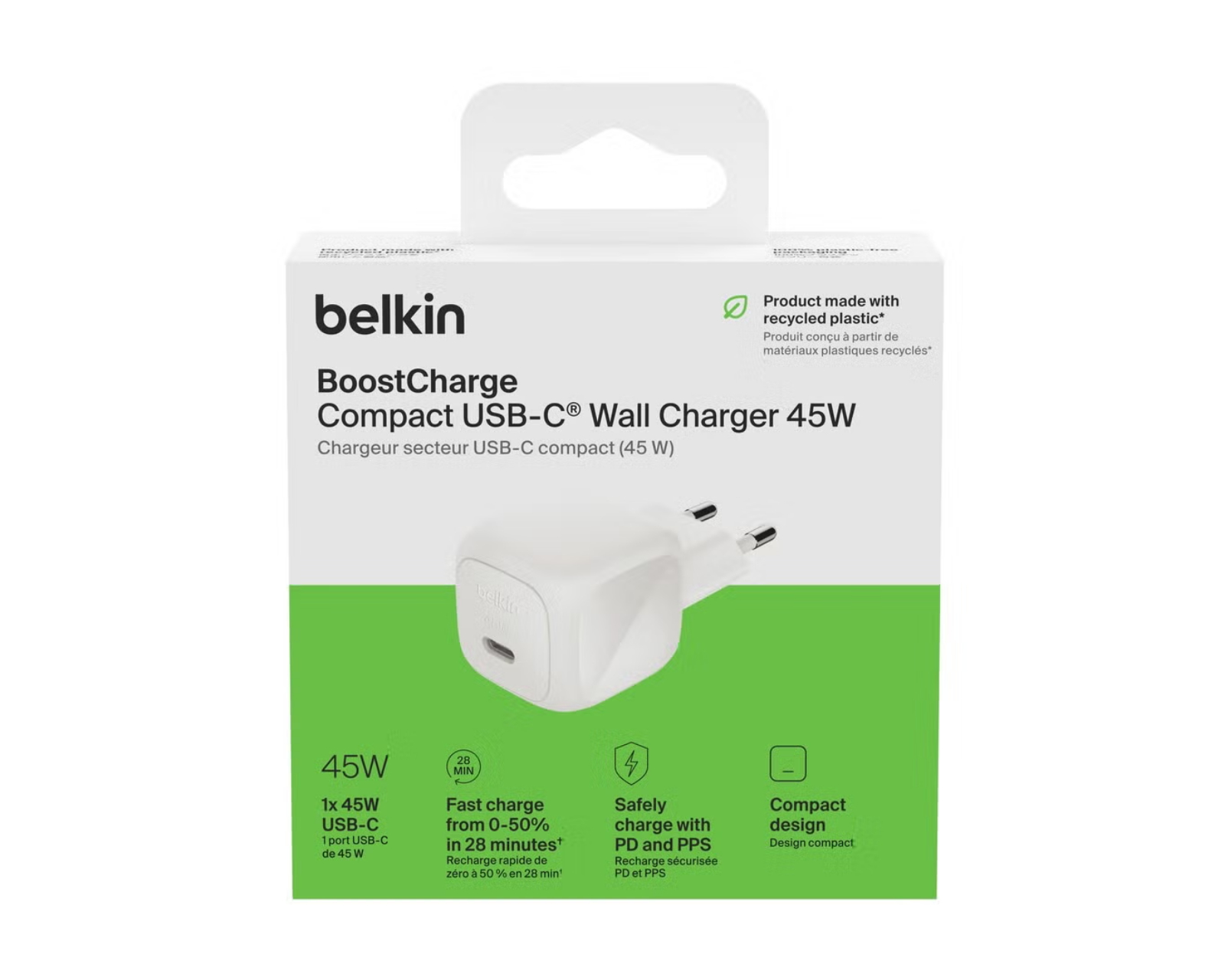 Denne oplader er USB-PD 3.1-certificeret og leverer en effekt på 45W, hvilket giver hurtig og sikker opladning for alle kompatible USB-C-enheder. Belkin BoostCharge er fremstillet af 72 procent genanvendt plast, hvilket bidrager til et mere bæredygtigt produkt. Opladeren leveres i en plastsnål emballage og har et mål på 33,5 x 33,5 x 34,5 mm. Den har en enkelt USB-C-port til tilslutning og kræver et separat ladekabel.