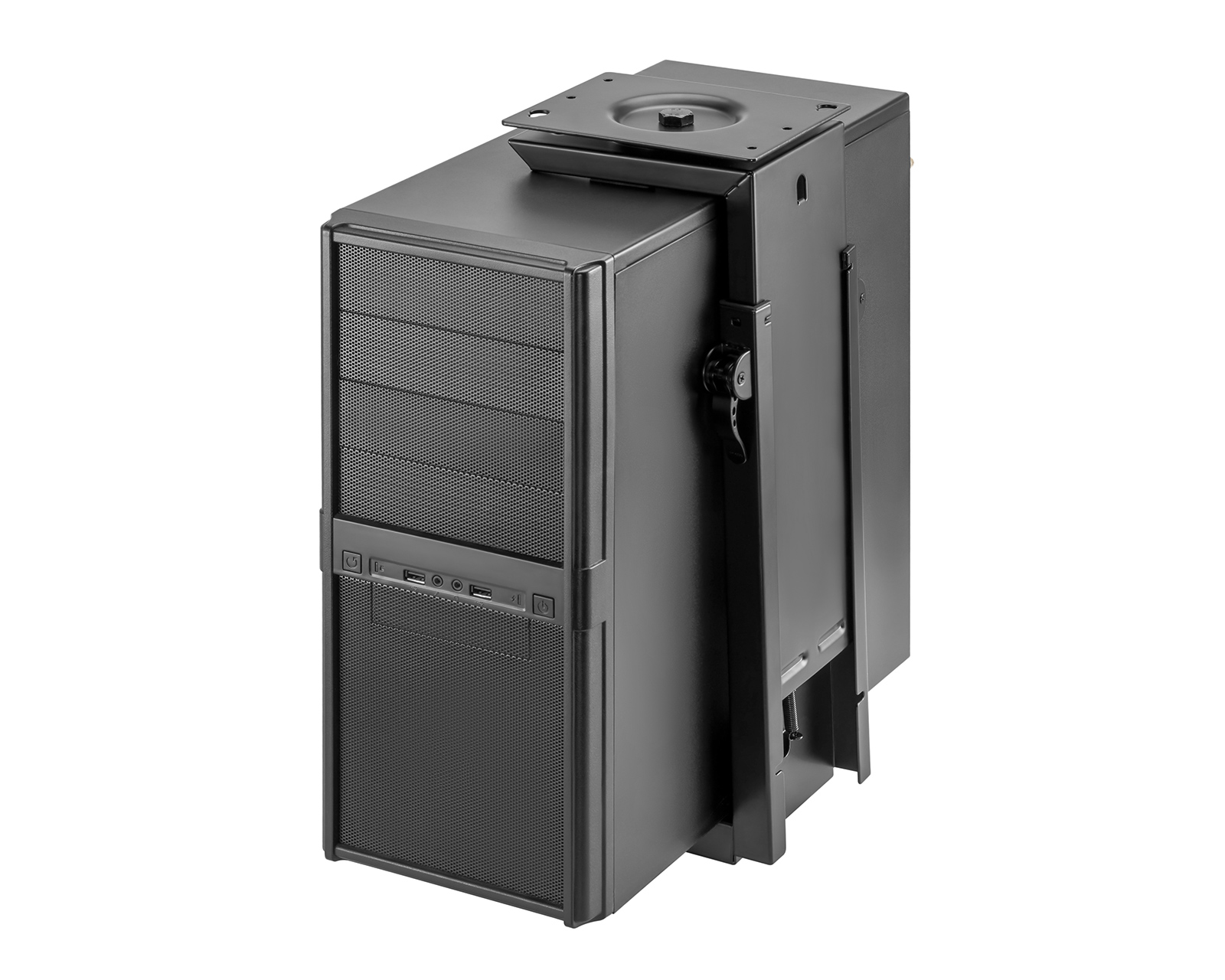 DEMO: Återköp och testexemplar. Bra skick.Deluxe computerholdere giver en sikker og pladsbesparende løsning til de fleste populære computeretuier og gaming computere ved at fjerne dem fra skrivebordet eller gulvet og montere dem under skrivebordet.