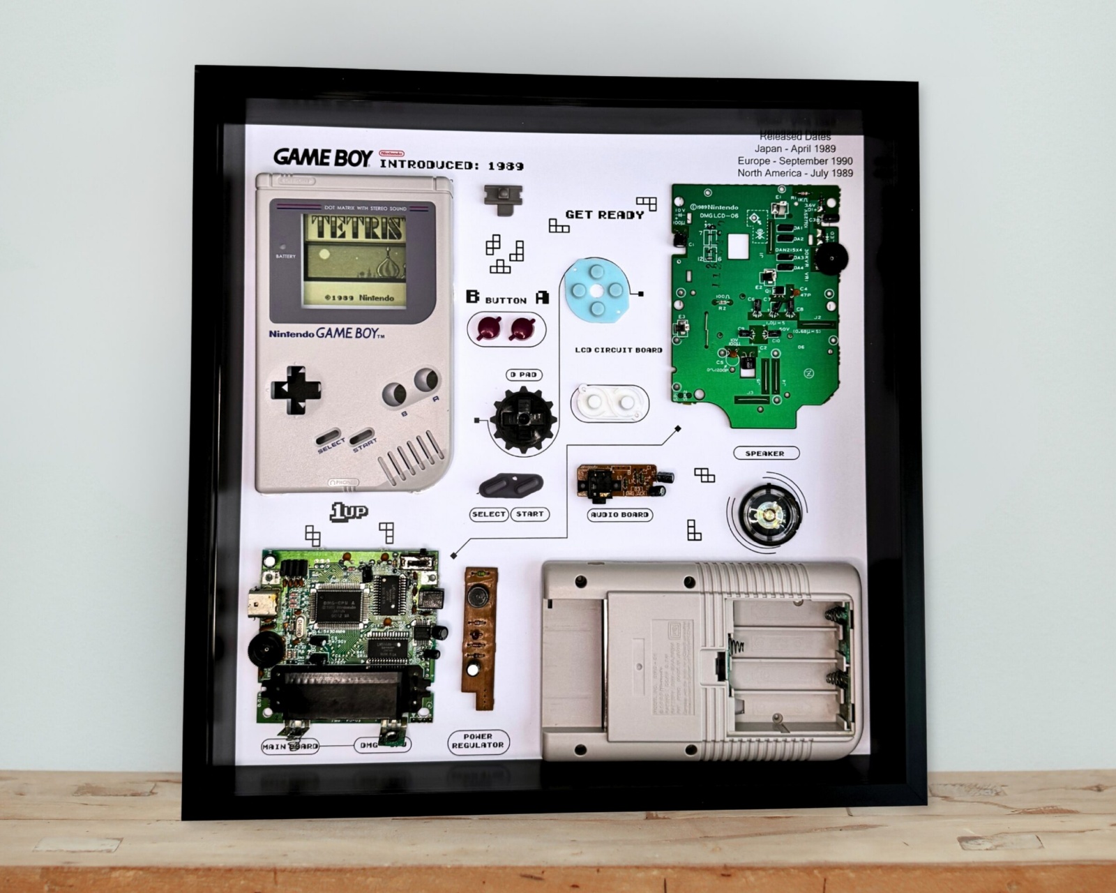 Enheden er fremstillet af holdbare materialer, der sikrer en langvarig holdbarhed. Designet inkluderer præcise mål og en finish, der omgiver den historiske følelse af den originale Nintendo Gameboy-konsol. Enheden er let at installere og kan placeres på en hylde eller i et spilrum, hvilket skaber en attraktiv visningsløsning for konsolentusiaster. Den er også skabt for at bevare konstruktionens oprindelige stil og det ikoniske udseende af Gameboy.