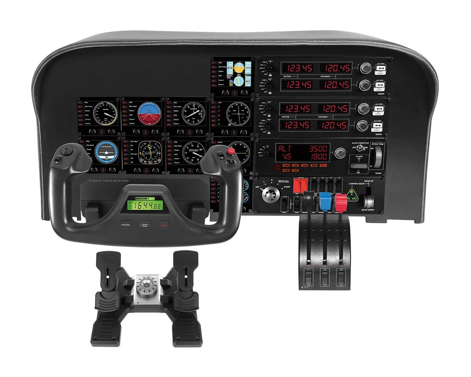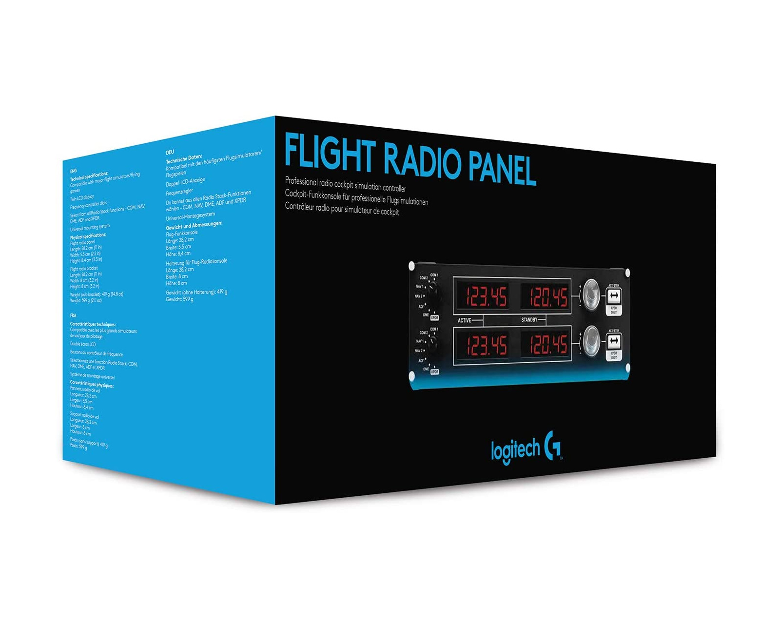Flyradiopanelen har fire indikatorskærme med kontroller til forskellige kommunikations- og navigationsfunktioner. Aldrig mere klodset betjening på skærmen for COM1/2, NAV1/2, DME, ADF og XPDR. Hver skærm fungerer i realtid med FSX, X-Plane og Prepar3D. En eller flere radiopaneler integreres nemt med flysimulatorcockpiten i dit hjemmeudstyr.