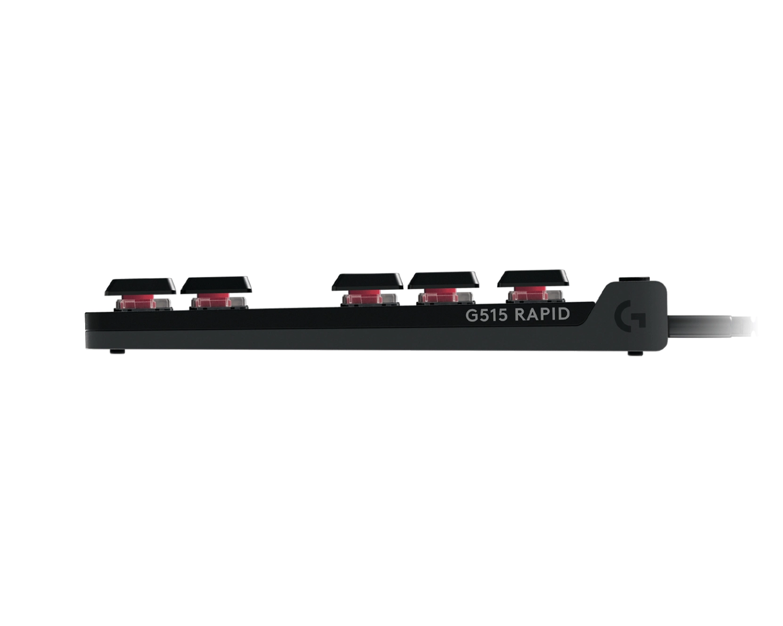 G515 RAPID TKL er udstyret med magnetiske analoge kontakter med en aktiveringskraft på 35 +/- 7 g og en total nedtryk på 2,5 mm. Den hurtige aktivering muliggør dynamisk genoprettelse for hurtigere gentagelser af tastetryk uden at løfte fingeren. Tastaturet vejer 800 g uden ledningen og har en ledningslængde på 1,8 m. Byggekvaliteten inkluderer en topplade i rustfrit stål og olieafvisende PBT-tastknapper med dobbelte lag, hvilket bidrager til lang holdbarhed under intensive spilsessioner. LIGHTSYNC RGB-belysning og tilpasset aktivering via G HUB-software giver yderligere konfigurationsmuligheder.