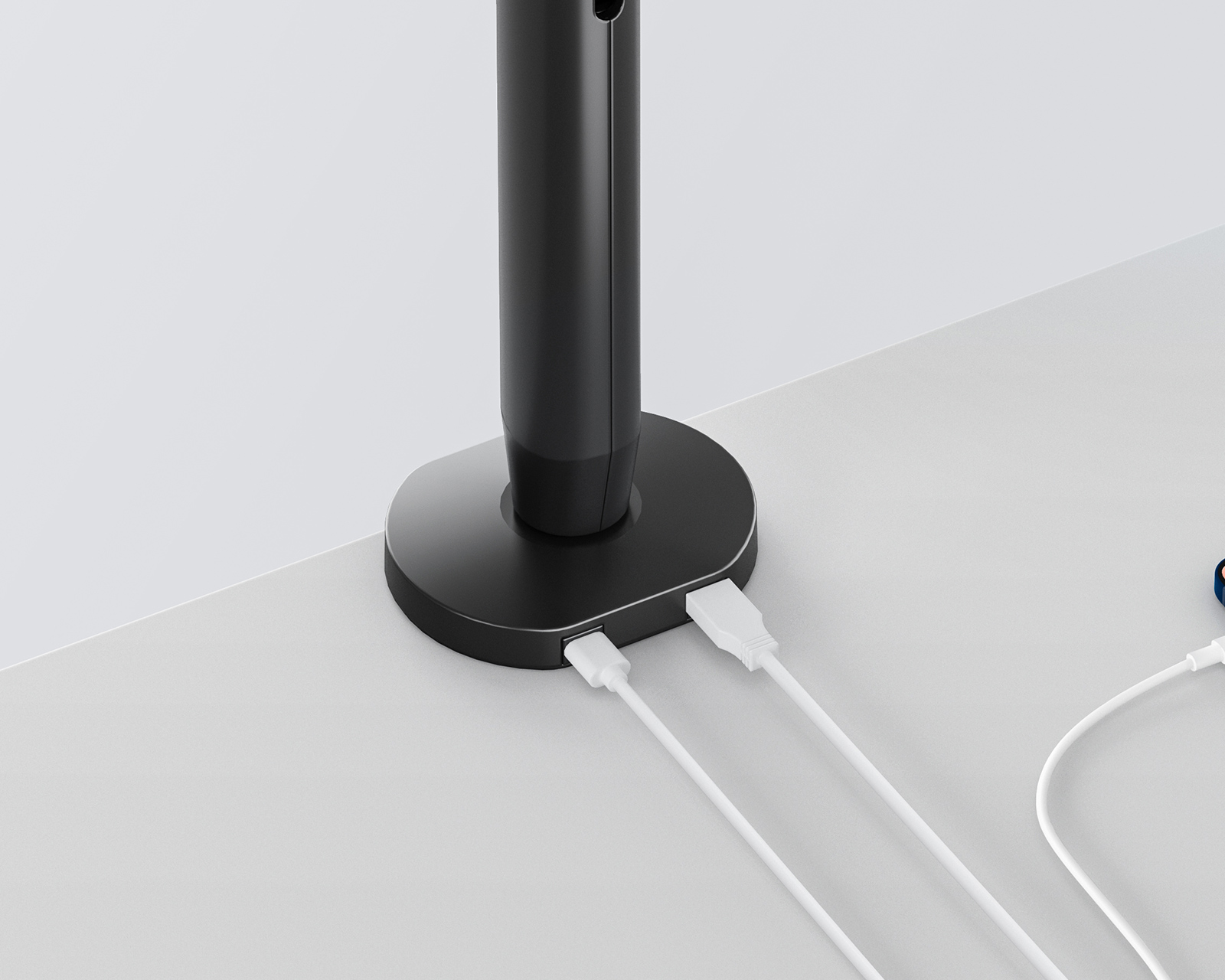MaxMount Flexy er ikke kun stilren, den er også praktisk. Basen er forsynet med USB-A og USB-C porte til hurtig datagennemgang og opladning, hvilket sparer værdifuld tid under dine intensive spilsessioner eller arbejdsdage. Den indbyggede kabelhåndtering holder kablerne organiserede og fri for filtre, hvilket gør skrivebordet pænt og rent. Med hurtigkoblingspladen bliver det nemt at montere og fjerne skærmen efter behov, mens rotationsstop på 180 grader forhindrer, at armen svænger ind i væggen eller andre skærme.
