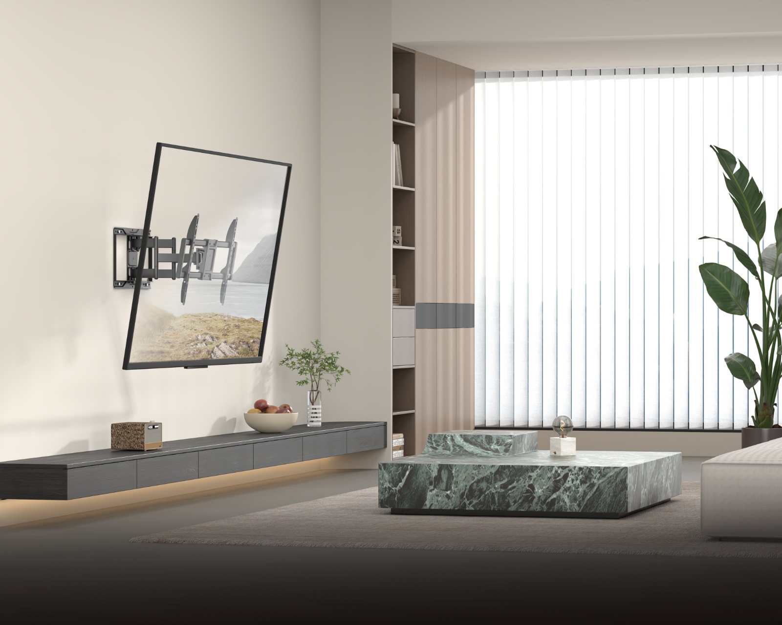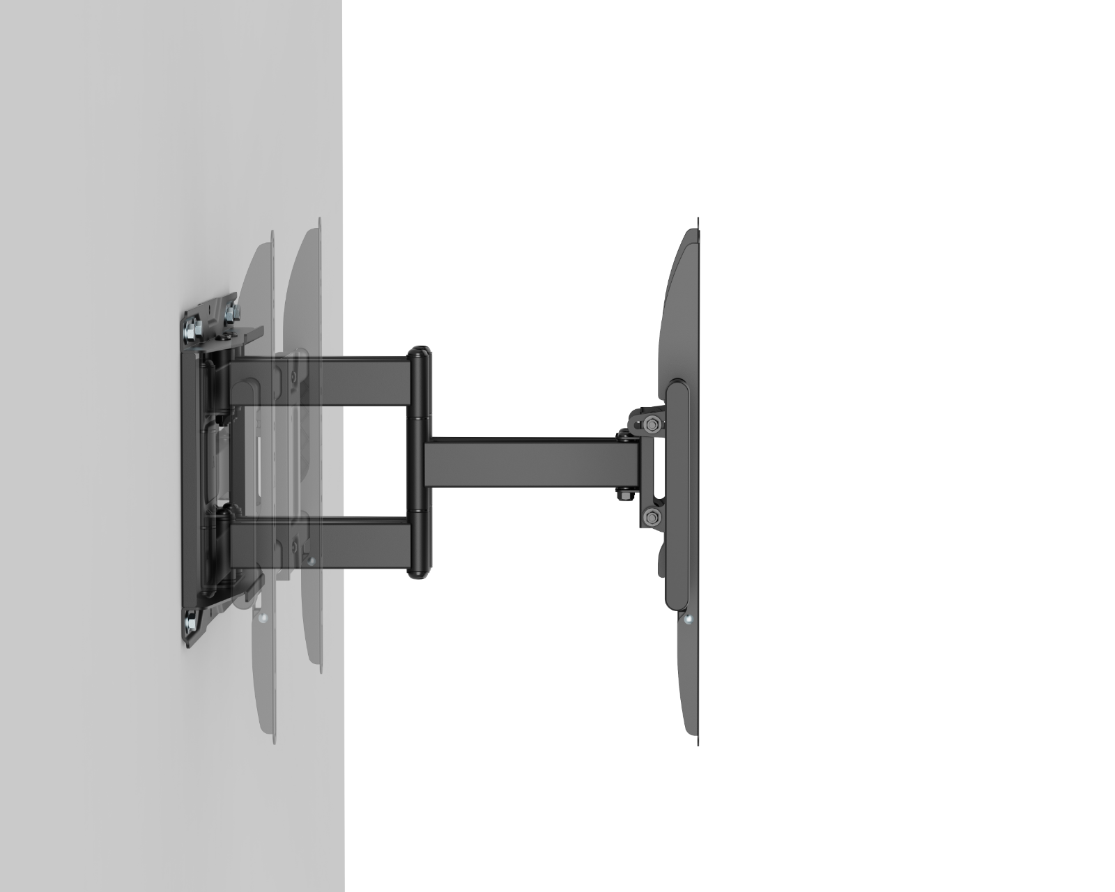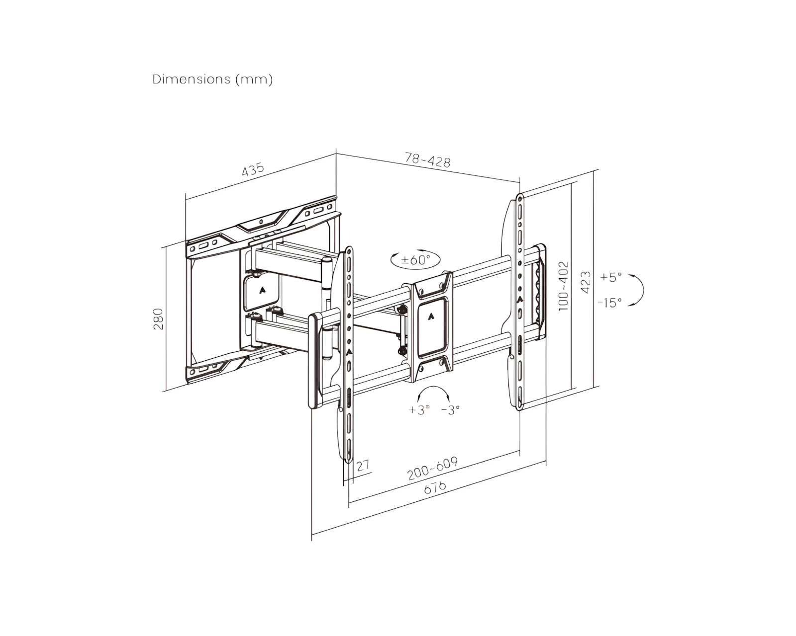Vægbeslaget er fremstillet af stål og plastik og har en maksimal hældning på +60° til -60°, hvilket giver brugeren mulighed for at justere vinklen for den bedst mulige billedevisning. Dens indbyggede kabelstyring sikrer en ren og organiseret installation, mens de niveaujusteringer, der er tilgængelige, muliggør finjusteringer efter installationen. Med et drejbart design kan du nemt tilpasse TV’et til forskellige visningsvinkler og optimere både funktion og komfort.