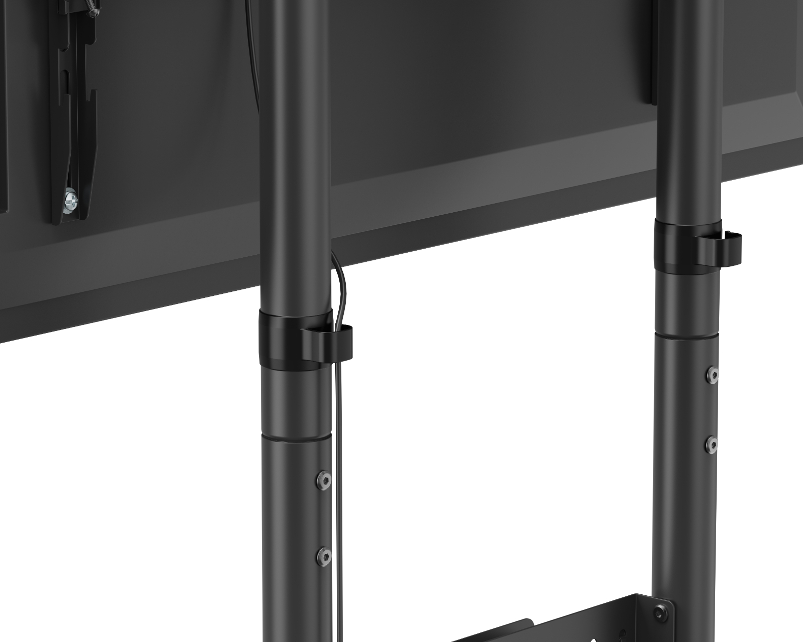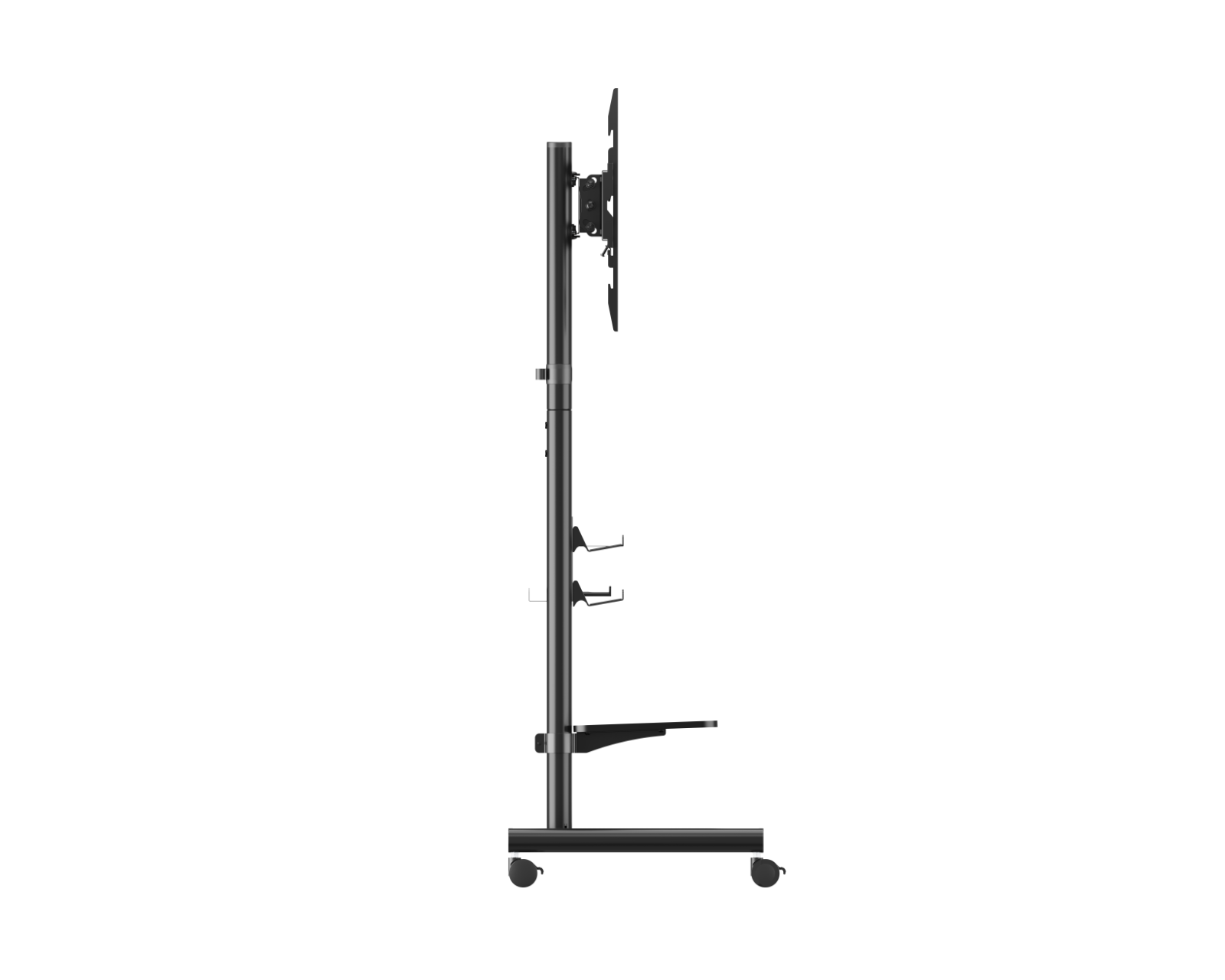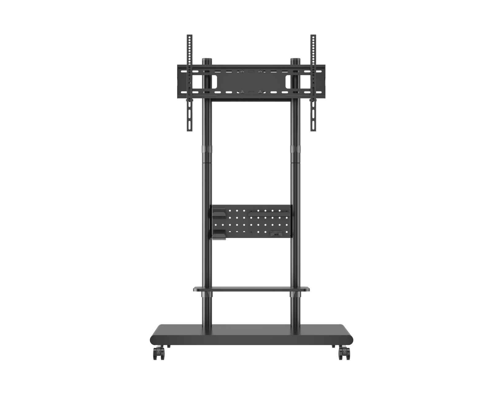 Enheden er konstrueret med fokus på stabilitet og holdbarhed, hvilket sikrer pålidelig ydeevne under brug. Pegboard-hylden muliggør en pæn opbevaring af kabler og tilbehør, hvilket reducerer rod. Udstyret med låsbare hjul for let manøvrering og en sikker placering af TV'en. Højdejusteringen er fleksibel og tilpasningsdygtig for at optimere synslinjer. En integreret kabelhåndtering sikrer, at alle kabler håndteres på en ordnet måde.