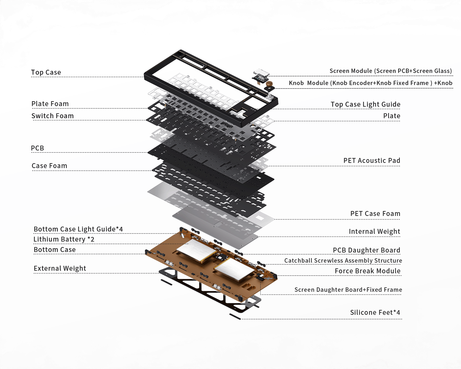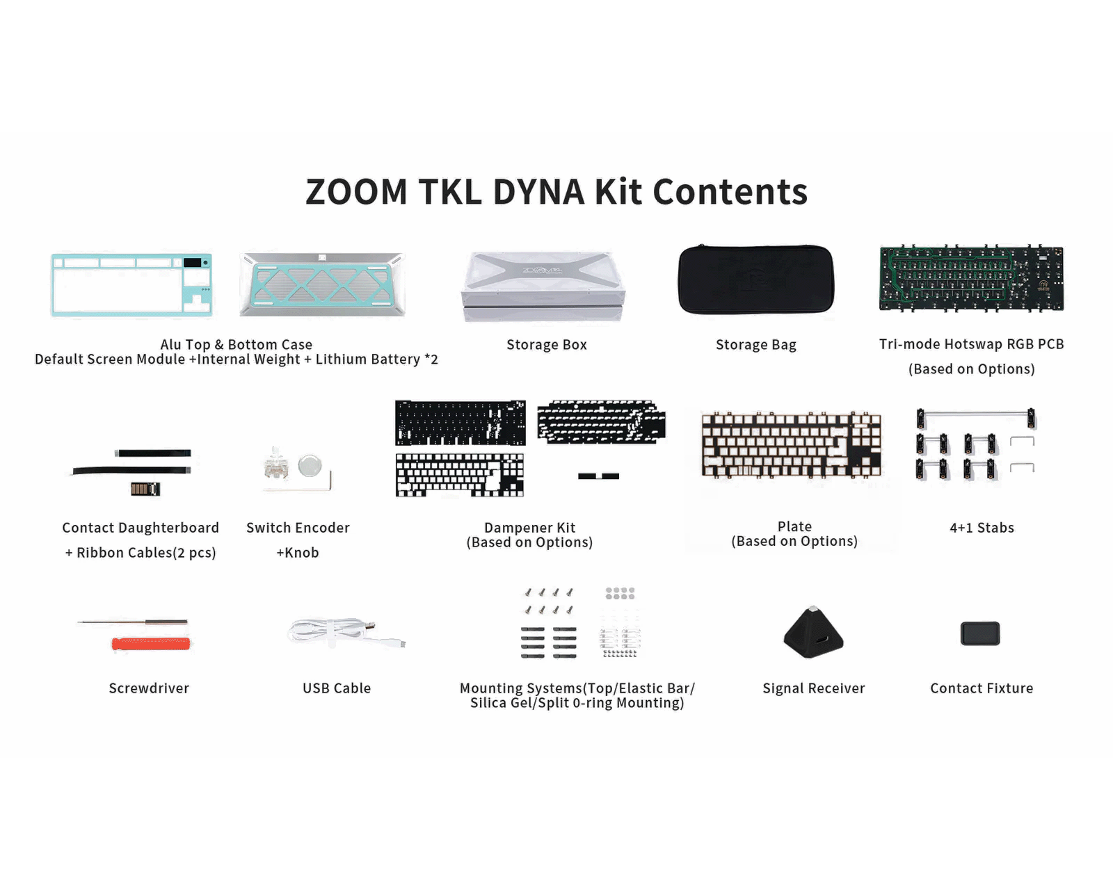 ZOOM TKL DYNA er et barebones-kit fra Wuque Studio, der tilbyder en alsidig brugeroplevelse. Det modulære design muliggør justeringer af skærmen og kontrollerne, hvilket giver brugerne frihed til at tilpasse deres indstillinger. Enheden har et 6063 aluminiumshus og et skruefrit kuglebeslagssystem for nemt at skifte mellem forskellige monteringsmuligheder. Den har understøttelse for både kablet tilslutning via USB-C samt trådløs via Bluetooth 5.4 og 2.4 GHz.