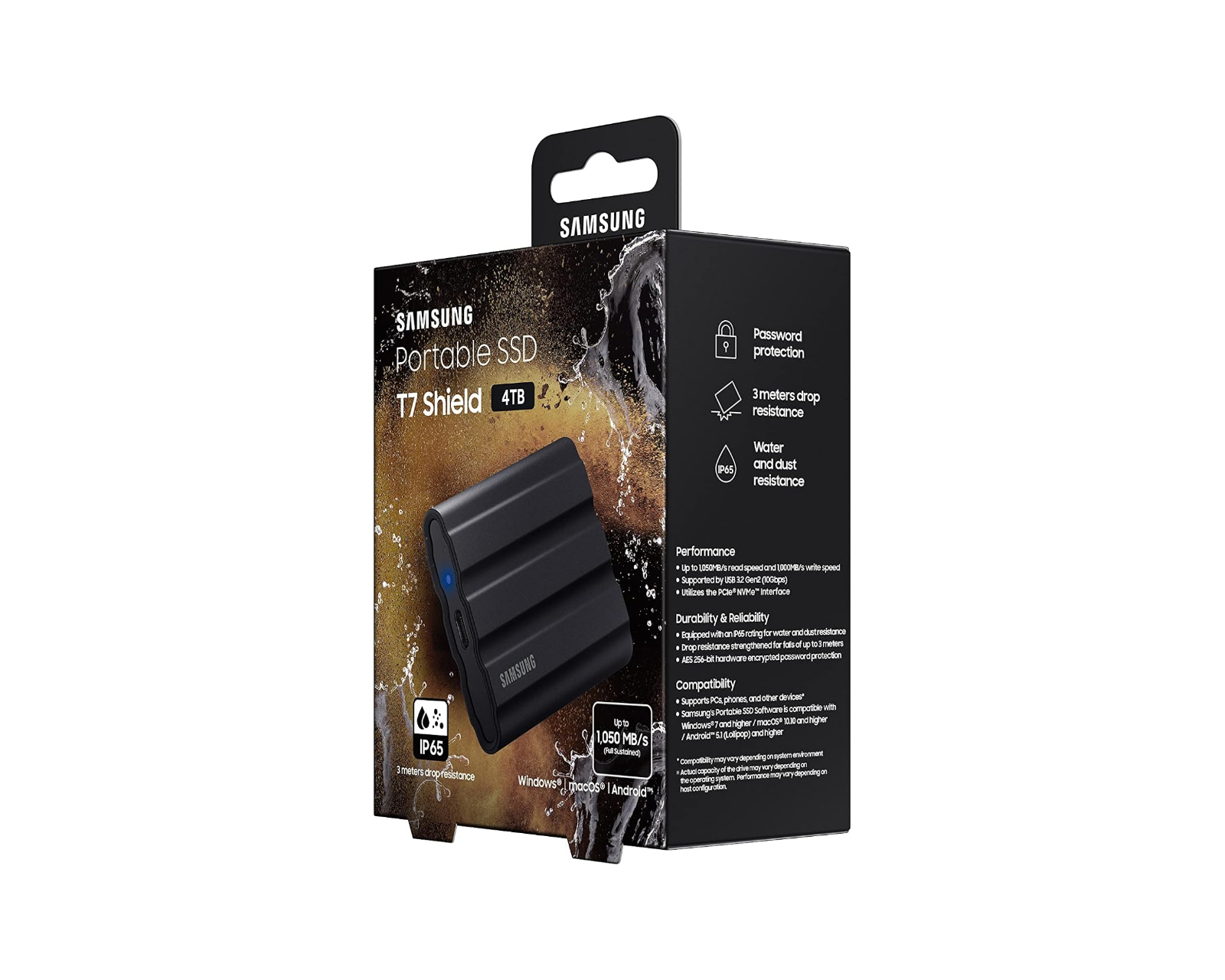 T7 SSD er en ekstern SSD-harddisk fra Samsung med en kapacitet på 4 TB. Enheden tilbyder læse-/skrevhastigheder på op til 1.050 MB/s, hvilket gør det muligt at kopiere og sikkerhedskopiere store mængder data hurtigt. Den robuste design er IP65-klassificeret, hvilket beskytter mod vand og støv. Den tilsluttes med et vendbart USB type-C-kabel, hvilket forenkler forbindelsen uden at bekymre sig om at få kabelen korrekt, og USB-C 3.2-grænsefladen muliggør høj båndbredde for hurtig dataoverførsel.Oversigt