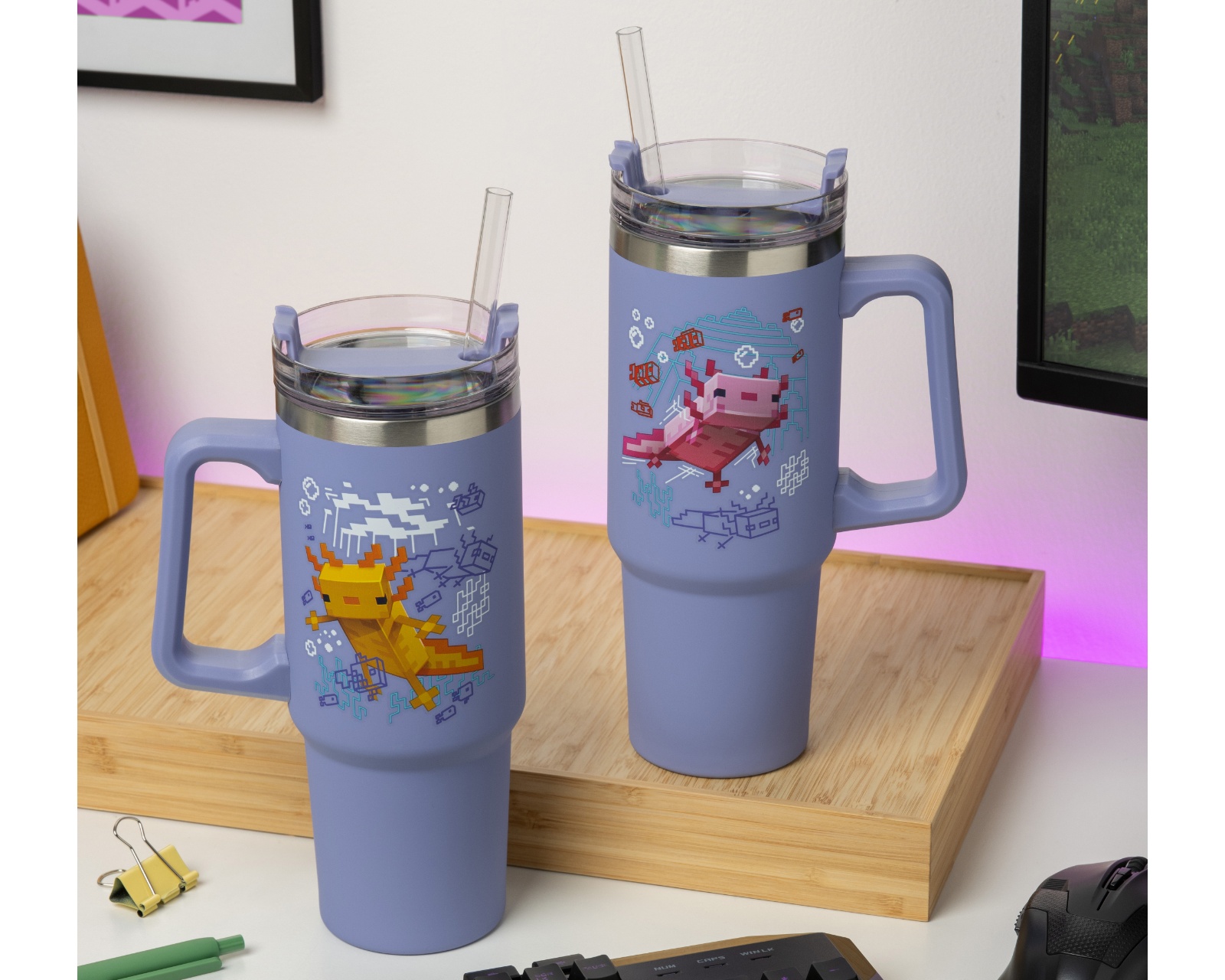 Minecraft Tumbler Cup 900ml er en isoleret drikkekop designet til at holde dine drikkevarer kolde eller varme i længere tid. Med en kapacitet på 900ml og en lilla farve er denne kop både praktisk og stilfuld. Den er perfekt til spilleentusiaster, der ønsker at have deres drikkevarer lige ved hånden hele dagen.Tumbleren har en innovativ tre-i-en-lågløsning, der inkluderer en lukket sugerørsåbning, et let tilgængeligt design og et beskyttende låg til brug på farten. Det praktiske håndtag er ergonomisk designet til at sikre et behageligt greb under transport. Den slanke base betyder, at koppen passer perfekt i de fleste kopholdere i bilen. Bemærk venligst, at koppen ikke tåler opvaskemaskine eller mikrobølgeovn og bør rengøres med varmt sæbevand for at bevare dekorationen.