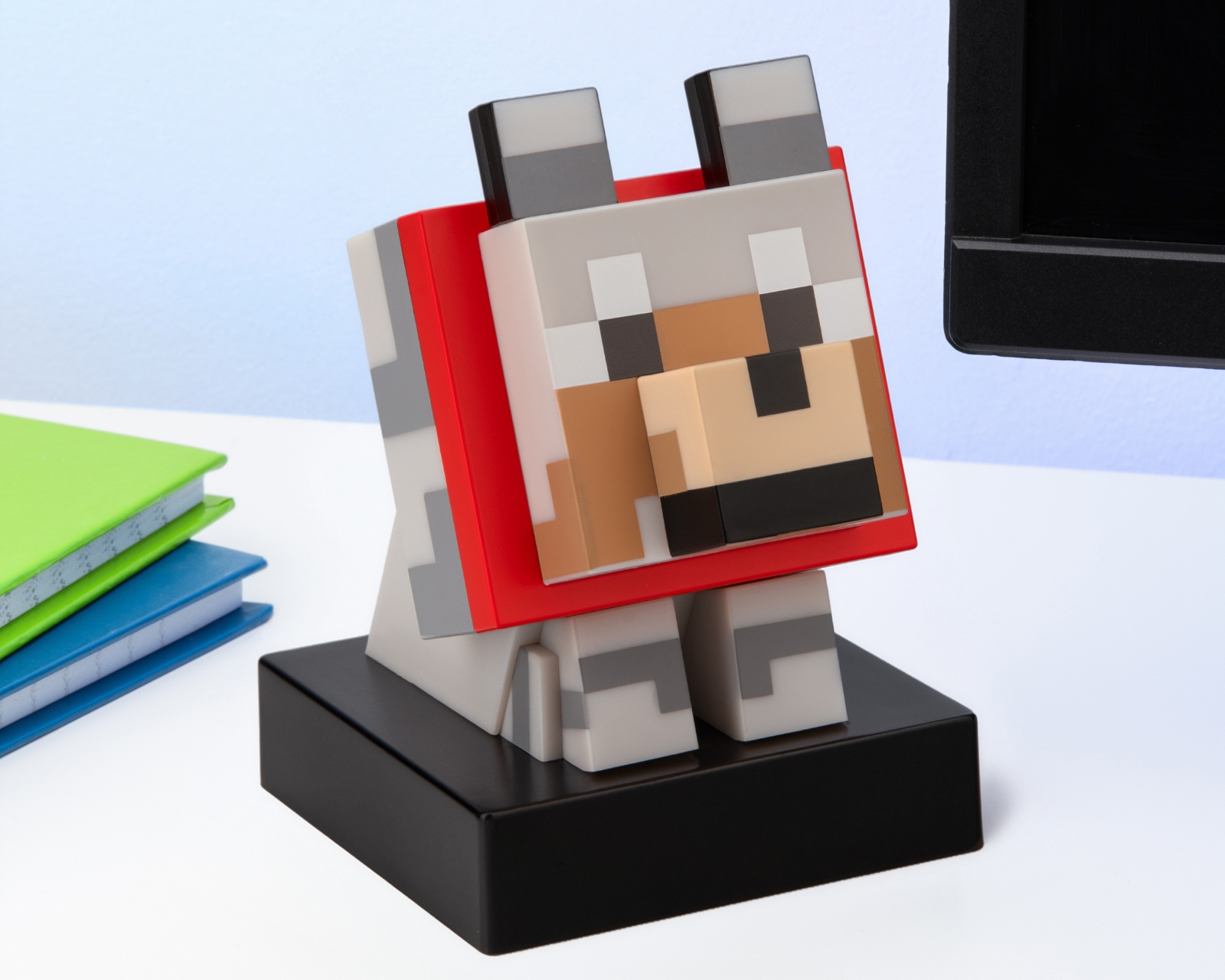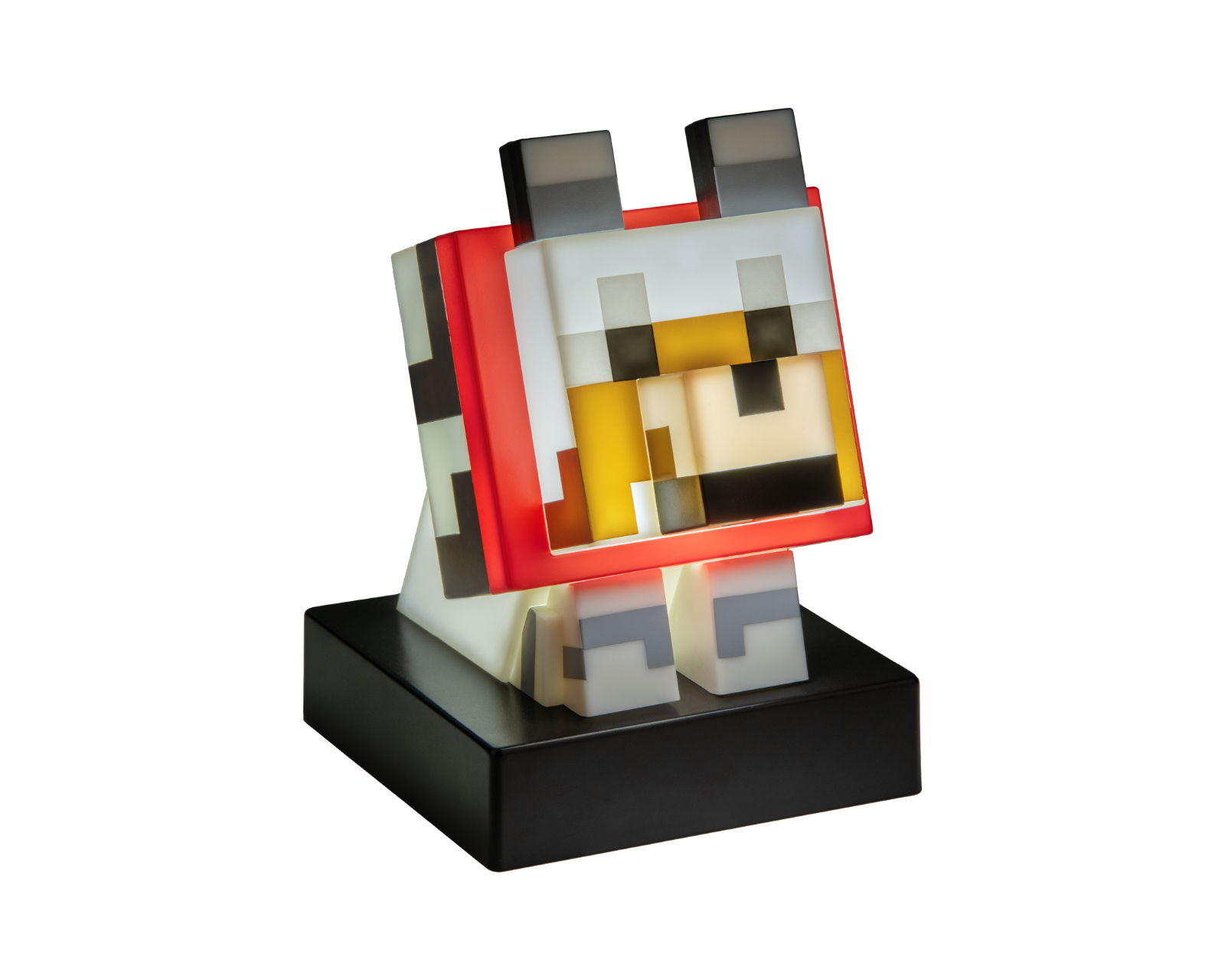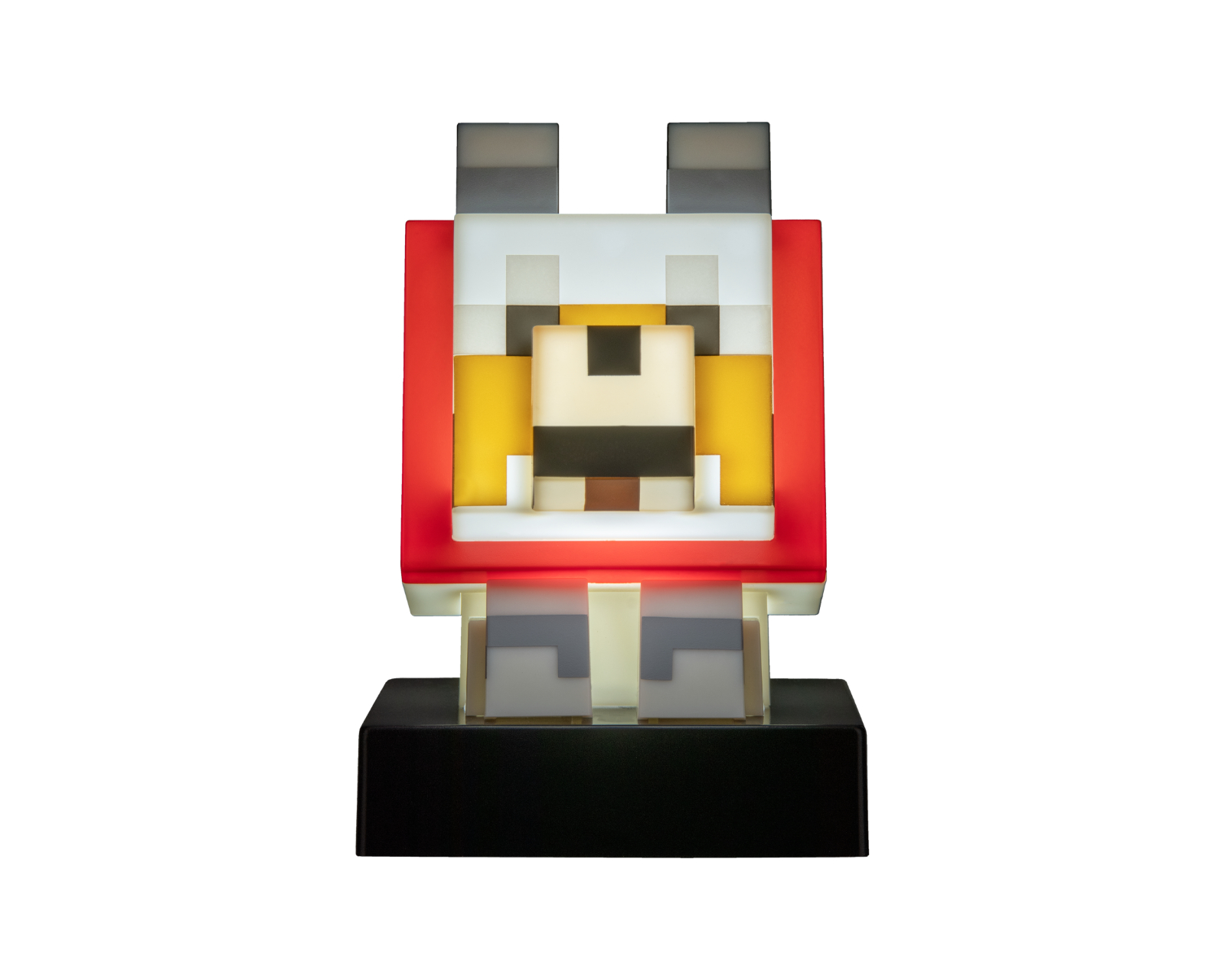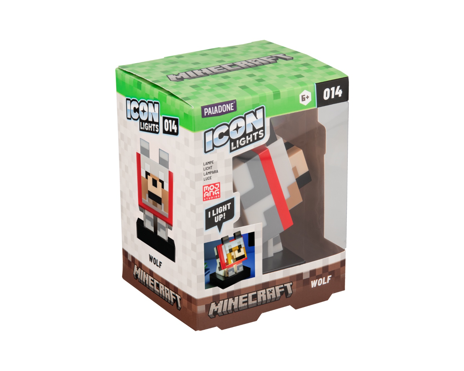 Icon Light - Wolf er en dekorativ belysning fra Paladone, som kombinerer funktion og design, og udgør et perfekt samlerobjekt for gamere. Den 11 cm høje lampe er formet som ulven fra Minecraft, prydet med et sødt rødt tørklæde. Når lampen er tændt, spreder den et blødt, varmt lys, der skaber en hyggelig atmosfære. Ideel til hylder eller natbord, giver den et charmerende indslag til ethvert rum.