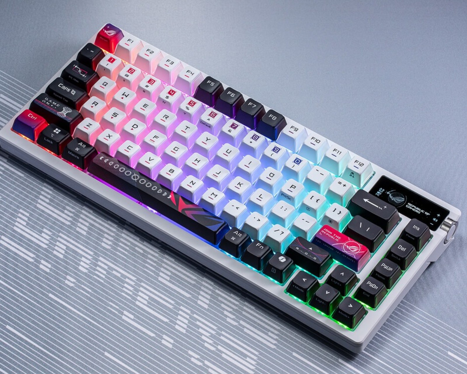 ROG Azoth X er et 75% gamingtastatur fra Asus, som tilbyder trådløs forbindelse og tri-mode forbindelse med ROG SpeedNova-teknologi. Det er udstyret med hot-swappable ROG NX V2 mekaniske switcher, hvilket muliggør lettere tilpasning af knapperne uden lodning. Tastaturet er designet til teknikentusiaster og gamere, som værdsætter en elit følelse ved skrivning og avanceret funktionalitet til gaming.Denne enhed har en metaloverflade og en FR4 positionsplade, som bidrager til en fleksibel skrivfølelse, sammen med fem lag af dæmpende skum og en gummikrop-ophængning, der effektivt absorberer vibrationer og lyd. Takket være en sødervendt PCB optimeres kompatibiliteten med forskellige keycaps og avancerede belysningsløsninger. Der er også en OLED-skærm, som viser systeminformation og indstillingsindikatorer, suppleret med et trevejs kontrolhjul for intuitiv funktionalitet. En silikone håndledsstøtte sikrer komfort og støtte under længere brugsessioner.