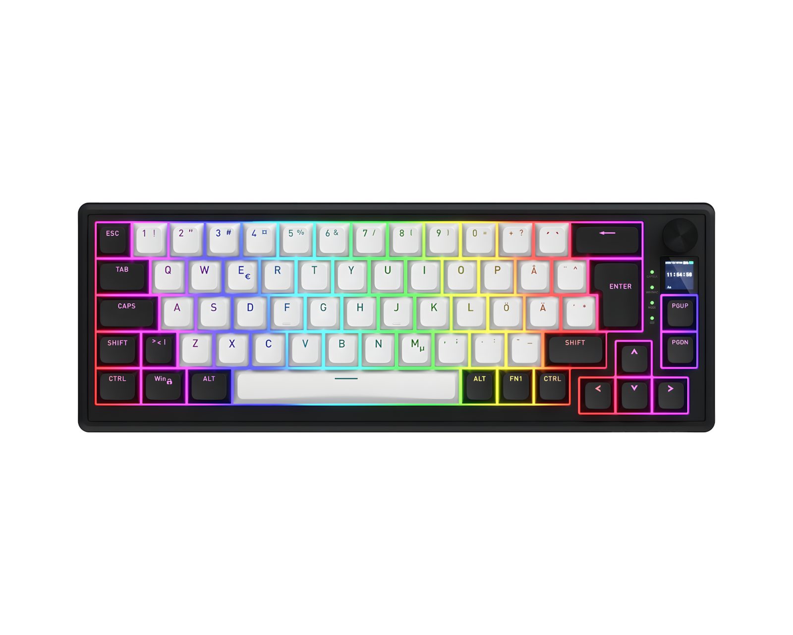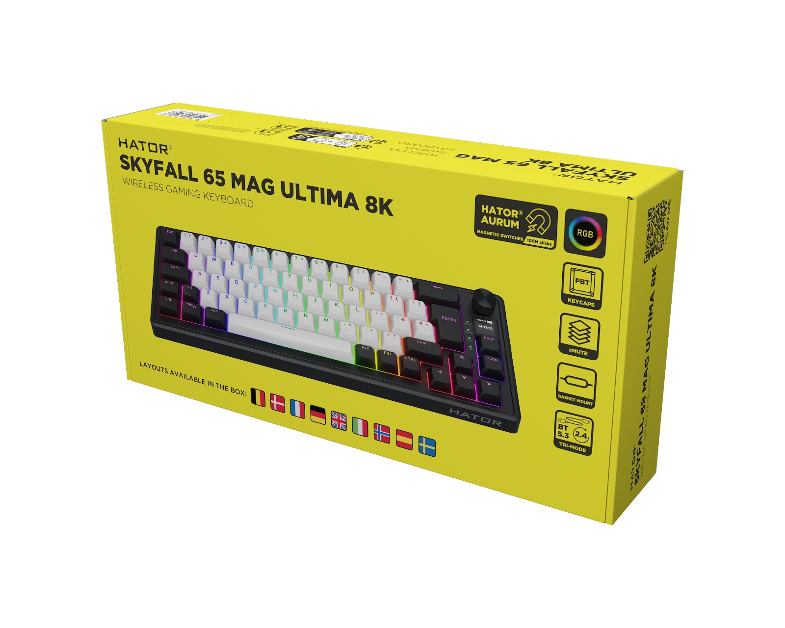 Skyfall 65% MAG Ultima 8K er et trådløst tastatur fra Skyfall, der kombinerer høj ydeevne med tilpasningsmuligheder. Med magnetiske Aurum Ice-brydere registreres hvert tryk med præcision, hvor aktiveringspunktet kan justeres individuelt for hver tast. Det tilbyder også en polling rate på op til 8000 Hz, hvilket minimerer forsinkelser ved registrering af tryk. I pakken medfølger også ekstra tastaturkapper til ISO-layouts: DE, Nordisk, IT, ES, FRA og BE.Tastaturets konstruktion er gasket-monteret og har flerskikts-lyddæmpning, hvilket giver et kontrolleret nedslag og reducerer resonans. Den fleksible tri-mode forbindelse via USB, 2.4 GHz eller Bluetooth sikrer en stabil og hurtig feedback. Digitale komponenter og en TFT-skærm giver hurtig adgang til indstillinger, mens den tilpasningsbare RGB-belysning tilbyder visuelle indikationer for hver tast. Derudover understøtter tastaturet hot-swap af brydere, hvilket forenkler justering uden behov for lodning.