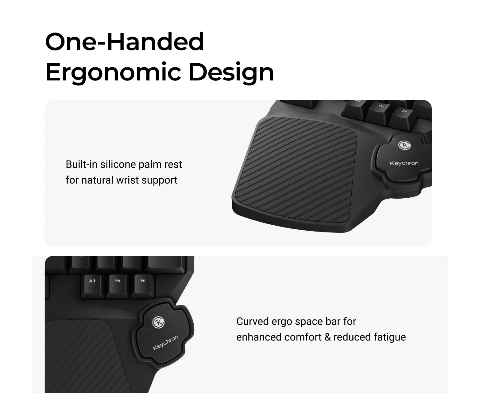 C0 HE 8K er et enkeltstående tastatur fra Keychron, der kombinerer høj ydeevne med et ergonomisk design. Det har 35 taster og er udstyret med Keychron Ultra-Fast Lime Magnetic Switches, hvilket giver hurtige og præcise tastetryk. Med en polling rate på hele 8000 Hz sikres minimalt inputlag til konkurrenceprægede spil.Byggekvaliteten er høj, med et chassis af plastik og aluminiumsplader, hvilket bidrager til holdbarheden. Tastaturet leveres med et integreret silikone håndstøtte for øget komfort under lange spilsessioner. Den webbaserede software Keychron Launcher gør det muligt for brugere at tilpasse taster og oprette makroer nemt online, uden at skulle installere software. Det understøtter også forskellige operativsystemer inklusive Windows, macOS og Linux.