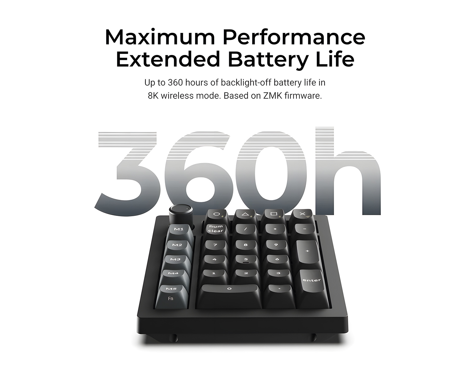 Keychron V0 Ultra 8K er et trådløst numpad fra Keychron, som tilbyder høj ydeevne og ergonomisk komfort. Den er udstyret med støtte til 2.4 GHz trådløs forbindelse, Bluetooth 5.3 og USB-kabel, hvilket giver fleksibilitet i forbindelsen. Enheden har en polling rate på 8000 Hz og en imponerende batterilevetid på op til 360 timer.Bygge kvaliteten i Keychron V0 Ultra 8K er exceptionel, med flere lag af akustisk skumisolering for en forfinet lydprofil. Den kraftfulde Arm-kerne (MCU) med 1 MB flash giver udviklere fleksibilitet, og ZMK softwaren muliggør nem tilpasning via Keychron Launcher. Numpaden er desuden hot-swappable, hvilket betyder, at spillere kan skifte switcher uden lodning. Belysningssystemet bruger south-facing RGB LED, hvilket forbedrer synligheden af baggrunds belysningen uden at blive påvirket af forskellige keycap-profiler.
