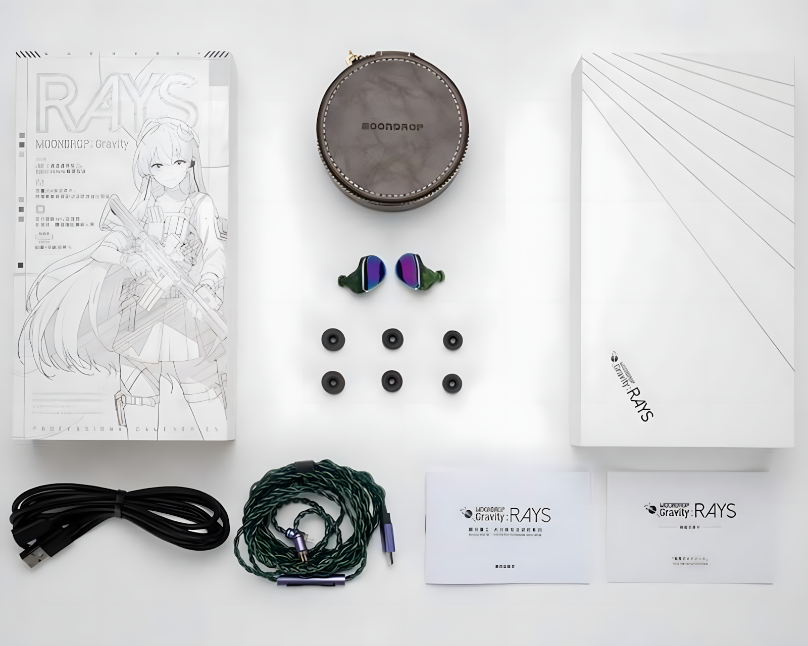 Rays In-Ear hovedtelefoner er en højtkvalitets lydløsning fra MOONDROP, designet til spillere og hi-fi entusiaster. Disse hovedtelefoner kombinerer professionel Hi-Fi lydteknik med en alsidig USB-C forbindelse. Med en følsomhed på 120dB/Vrms og et frekvenssvar mellem 7Hz og 39kHz giver de en detaljeorienteret og dynamisk lydoplevelse.Kvaliteten af byggematerialet i hovedtelefonerne er af højeste klasse, hvor der er brugt medicinsk grad 3D-udskrivning for at sikre både komfort og holdbarhed. Den indbyggede DSP (Digital Signal Processor) muliggør gemmes af lydindstillinger, hvilket gør det muligt for brugere at skræddersy lydprofilen efter personlig smag. Ear-tips i tre forskellige størrelser sikrer en optimal pasform, hvilket forbedrer både lydisolering og brugerkomfort. Hovedtelefonerne er udstyret med en AI-baseret støjreduceringsmikrofon, der forbedrer samtalekvaliteten og dermed er ideelle til både spil og kommunikation.