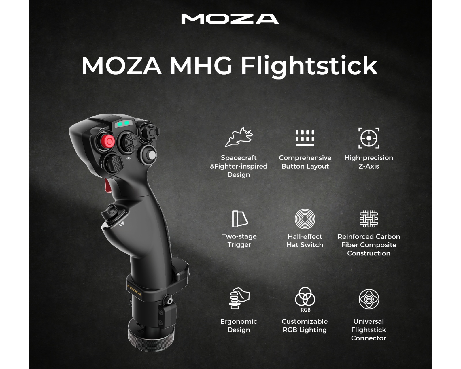 MHG Flygspak er en højtydende flygspak fra Moza Racing, designet til simpiloter og rumbaserede spilentusiaster, der ønsker en dybere oplevelse og forbedret kontrol gennem force feedback. Den er designet med inspiration fra rumskibe og jagerfly og tilbyder et intuitivt og komfortabelt grebdesign, der forbedrer flyveoplevelsen. Med et komplet sæt knapper og kontakter kan brugere nemt tilpasse deres kontroller til over 25 virtuelle indgange gennem MOZA Cockpit.MHG's robuste konstruktion i høj kvalitet kulfiberforstærket kompositmateriale sikrer holdbarhed under krævende brug. Med en præcis Hall-effekt sensor for Z-aksen (rulning) samt en to-trins aftrækker for øget kontrol under kampsituationer, tilbyder den både følelse og præcision. Den ergonomiske design og den teksturerede overflade forhindrer glidning under langvarig brug. Yderligere egenskaber inkluderer tilpasselig RGB-belysning og en universal forbindelse, der gør den kompatibel med alle MOZA-baser.