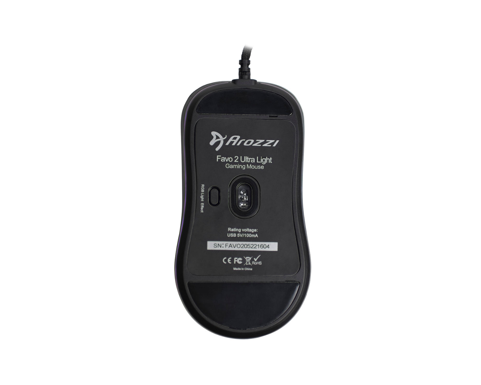 Arozzi Favo 2 er en gamingmus, som kombinerer lav vægt med avanceret teknik. Udstyret med en Pixart 3389-sensor, tilbyder denne mus en præcis følsomhed og justerbart DPI-interval fra 200 til 16000. Musen er bygget med Omron 20M-switches og er designet til spilleres behov for hastighed og præcision.Favo 2 er konstrueret med fokus på brugervenlighed og ergonomi. Med en vægt på kun 74 gram er denne ultralette gamingmus en af de letteste på markedet. Musen har seks knapper, som kan tilpasses efter spillerens præferencer, og inkluderer RGB-belysning, som kan styres direkte via musen eller gennem Arozzi's software. Den nye skal har en modificeret form og størrelse for at forbedre brugeroplevelsen.