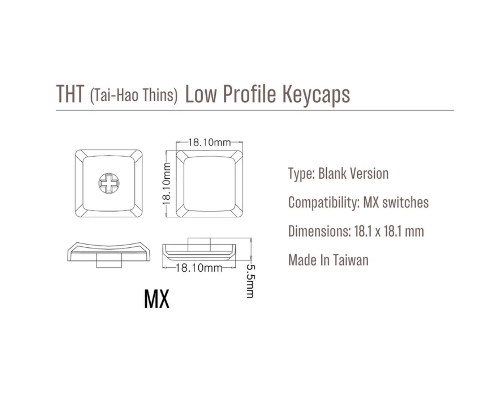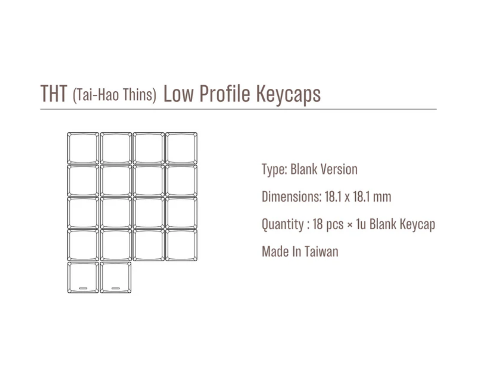 Low-profile keycaps er et sæt med 18 stk. blanke keycaps fra Tai-Hao, fremstillet i PBT-materiale. Sættet indeholder 16 keycaps samt 2 bonusnøgler og er designet til brug med Choc V1-switches. Keycapsene har en THCS-profil og målene er 16,5 × 17,5 mm. Det specifikke PBT-materiale giver høj holdbarhed og slidstyrke, hvilket er særligt vigtigt for gamere, der søger langvarig ydeevne.Den lave profil bidrager til en ergonomisk skriveoplevelse, mens de stille tastetryk minimerer lydniveauet. Den minimalistiske design uden mærkninger giver en stilren æstetik, der passer til forskellige setup-konfigurationer.
