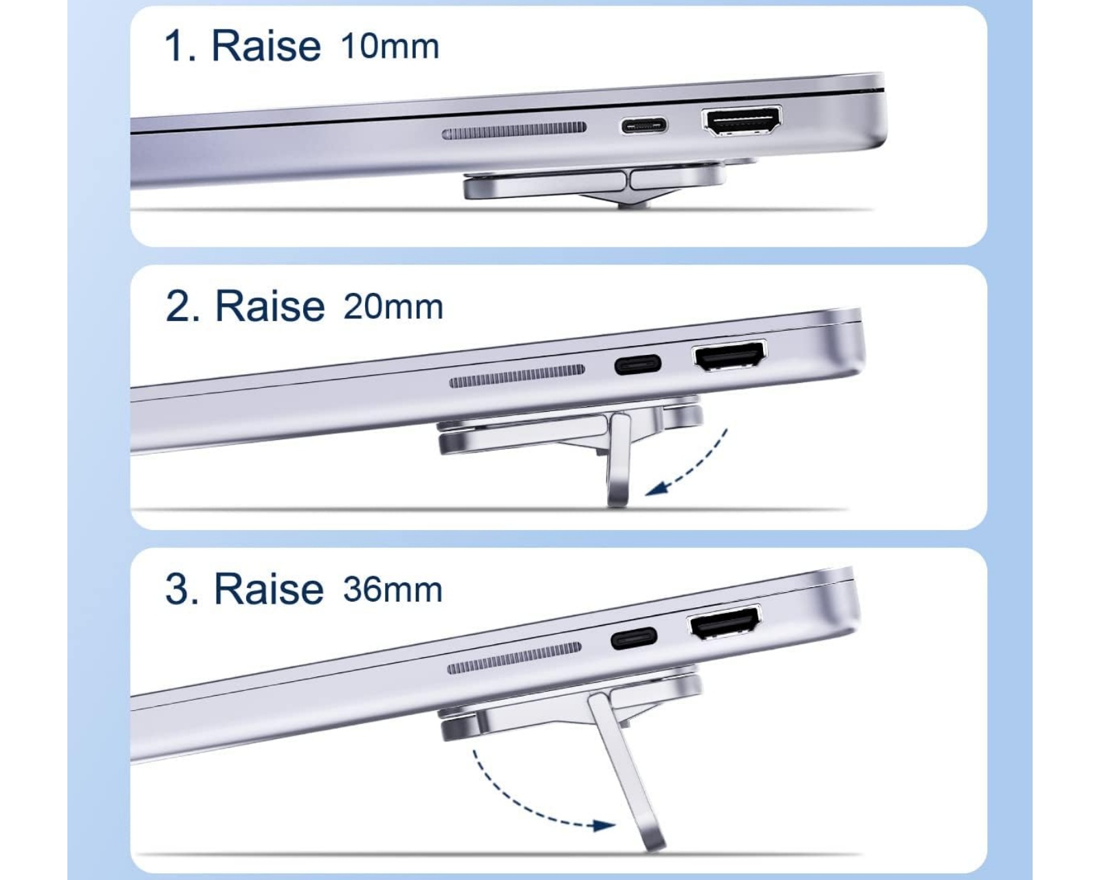 Hagibis Laptopståll er en justerbar enhed, der muliggør ergonomisk brug af bærbare computere. Ståen er fremstillet af en aluminiumslegering, som også fungerer som en varmeafleder for at forbedre afkølingen af computeren. Den tilbyder tre forskellige højder at justere mellem, hvilket gør den mångsidig til forskellige anvendelsesmetoder. Stået er passende til brug med bærbare computere mellem 12 og 17 tommer, hvilket gør det ideelt til både studerende og fagfolk.Materialet i Hagibis Laptopståll er overfladebehandlet for at give en stabil og holdbar konstruktion. Den har et design, der øger luftcirkulationen og forhindrer overophedning ved at løfte computeren fra overfladen, den placeres på. Højden kan justeres i tre trin: 10mm, 20mm og 36mm, hvilket muliggør en tilpasset arbejdsstilling. Den faktiske overflades forstørrelse bidrager også til at øge stabiliteten, hvilket mindsker risikoen for, at den bærbare computer tipper over. Stået er kompatibelt med både MacBook-modeller og andre bærbare computere samt tablets.