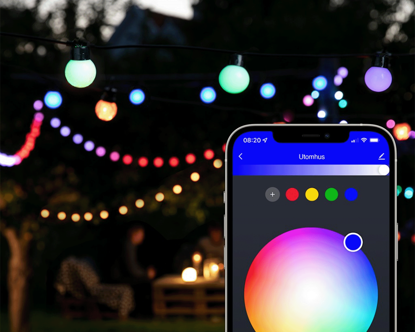 Forvandl dine rum med Lite Bulb Moments Smart Light Chain - Globe, udviklet til at skabe atmosfærisk belysning både indendørs og udendørs. Med en 14 meter lang lysstreng og 64 millioner farvekombinationer kan du nemt tilpasse belysningen til enhver lejlighed, hvad enten det er en sommerfest, en hyggelig aften derhjemme eller årets julepynt. Brug Lite-appen til at tilpasse lysstyrke, farver og tilføje timere, der automatiserer din lysoplevelse. Lysstrimlen er kompatibel med Google og Alexa, hvilket gør lysstyringen enkel og smart ved hjælp af stemmestyring.Den indbyggede mikrofon reagerer på musik og lader lysene blinke og skifte farve til takten, hvilket tager feststemningen til næste niveau. Dens IP65 vandtætte klassificering betyder, at du kan bruge lysslyngene udendørs hele året rundt, uanset vejret, uden at skulle bekymre dig om regn eller sne. Den er lavet til at modstå hverdagens udfordringer og har en imponerende levetid på 30.000 timer. Perfekt til at hænge rundt om en parasol, et juletræ eller som pynt i hele huset.