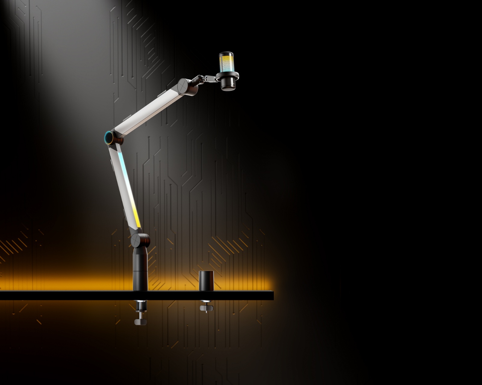 Aluminium Dynamisk RGB Mikrofonarm er en premium mikrofonarm fra MaxMount, designet til at forbedre både professionelle gaming- og streamingmiljøer. Den integrerede volumenkontrol giver brugeren mulighed for nemt at justere systemvolumen, mens det unikke designkoncept med et uendeligt spejl ved leddet og RGB-strips langs den nedre arm skaber en iøjnefaldende visuel effekt. Mikrofonarmen er bygget til holdbarhed og stabilitet, hvilket kombinerer pålidelig ydeevne med en moderne æstetik for at tilbyde en højkvalitets løsning til indholdsskabelse og liveproduktion.Mikrofonarmen er fremstillet af kvalitetsmaterialer som aluminium, plast og stål, hvilket giver en holdbar konstruktion. Med sin maksimale vægtkapacitet på 1,5 kg og en justerbar højde på op til 1028 mm kan brugeren nemt tilpasse armens position for at opnå optimal komfort under livestreaming. Den dynamiske RGB-belysning skaber levende farveeffekter, der kan tilpasses efter stemningen. Kabelhåndteringen holder alt organiseret og frit for rod, og takket være 3/8” og 5/8” adapters er mikrofonarmen kompatibel med de fleste standardmikrofoner.