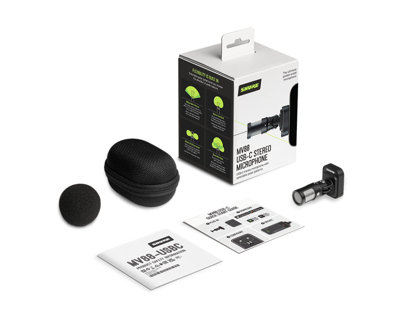 MV88 USB-C er en stereo mikrofon fra Shure, som tilbyder en hurtig og nem lydopgradering til mobile enheder. Den tilsluttes direkte til enhedens USB-C-port, hvilket eliminerer behovet for parring eller opladning. Med hjælp fra de gratis Shure MOTIV-apps kan brugeren konfigurere lyd- og videoindstillinger til forskellige optagebehov.Denne mikrofon har fire valgbare retningskarakteristika: stereo, mono cardioid, mono dobbeltrettet, og raw mid-side. Den gør det muligt at tilpasse optagelsen til forskellige situationer, uanset om det handler om feltoptagelse, vlogging eller interviews. MV88 er kompakt og nem at bruge, hvilket gør den til et praktisk værktøj for kreative, der ofte er på farten.