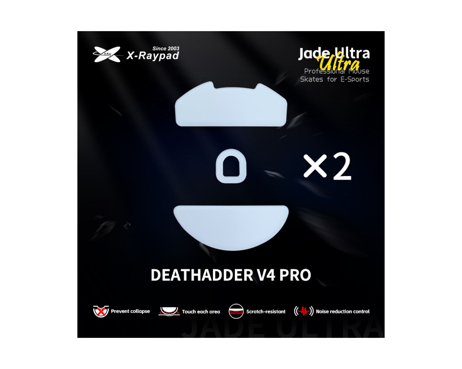 Jade Ultra Skates til Razer DeathAdder V4 Pro er et sæt muse skates fra X-raypad, designet til at forbedre musens ydeevne og holdbarhed. Disse skates har en tykkelse på 1 mm (+/-0,1 mm) og tilbyder en ren PTFE-overflade, hvilket reducerer friktion og øger glideevnen. Med et ekstra fyldlag for at forhindre sammenbrud og forbedret teknologi til lyd- og vibrationsreduktion er disse skates særligt velegnede til både stof- og plastmusmåtter.Materialerne, der anvendes i Jade Ultra-serien, er specielt udvalgt for at sikre holdbarhed og modstandsdygtighed mod ridser. Den PTFE-baserede overflade giver en gnidningsfri kontakt mellem musen og underlaget, hvilket sikrer, at gameren får en jævn og præcisionsrettet bevægelse. Ved at tage hensyn til akustiske egenskaber har museskøjterne også fået prægning for at kontrollere lyd og vibrationer under brug.