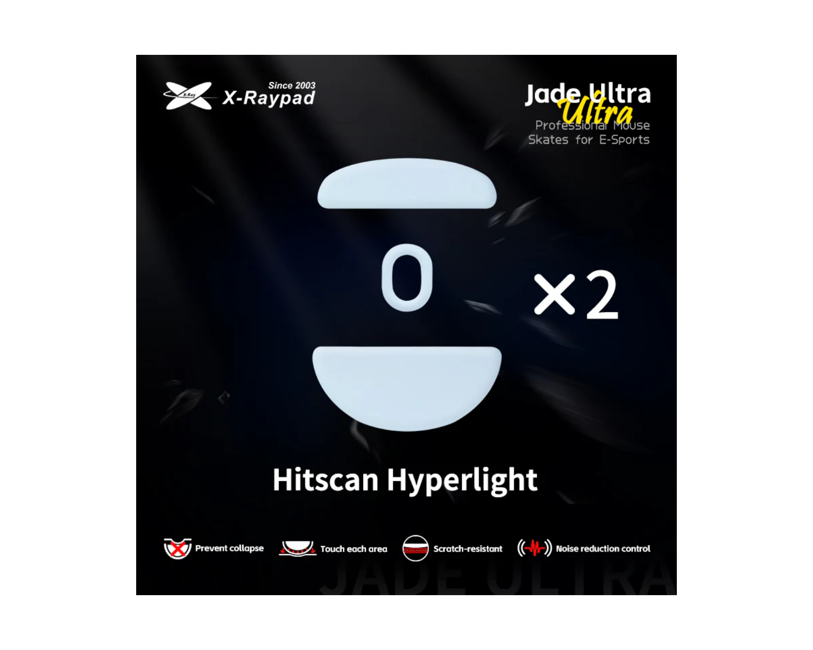Jade Ultra Skates før Hitscan Hyperlight er skridsikre museskader fra X-raypad, designet til at forbedre brugeroplevelsen ved gaming. Med en tykkelse på 1 mm (+/-0.1mm) tilbyder disse skader en ren PTFE-overflade, der gør, at musen glider glat over underlaget. Produktet er udviklet til gamere, der søger høj præcision og reduceret friktion, hvilket er afgørende ved hurtige spiløjeblikke. Skaderne er tilpasset både stof- og plastmussemåtter, hvilket giver fleksibilitet og anvendelse på forskellige overflader.Jade Ultra Skates er konstrueret med et ekstra anti-kollaps fugtlederlag, der bidrager til at forhindre nedfald og udfyldning af skader ved hård brug. Overfladen er ridsefast og modstår slid, hvilket forlænger levetiden. Samtidig betyder den akustiske dæmpningsteknologi en reduktion af lyd og vibrationer ved brug, hvilket øger komfort og fokus for brugeren.