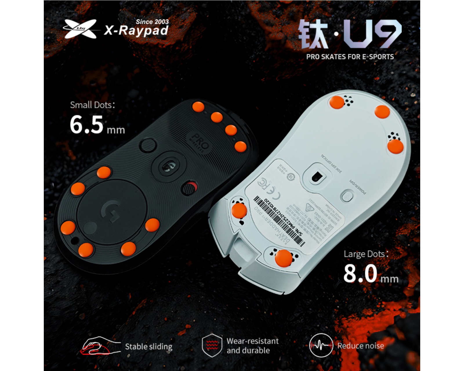 U9 Air 8mm er et sæt dot skates fra X-raypad designet til computer muse. Dette produkt er optimeret til brug på glas mousepads, samtidig med at det er kompatibelt med stof mousepads. U9 Air skates bygger på en flerlagersstruktur og bruger ultra-høj molekylvægt polyethylen (UHMWPE), hvilket giver en holdbarhed, der er ni gange mere modstandsdygtig overfor slid. Skatesene er designet til at eliminere rystelser og for at sikre en ensartet målsætning og tryghed i hver bevægelse.Materialet, der anvendes i U9 Air, er af den højeste kvalitet med hensyn til slidstyrke og byggekvalitet. Med et nøje konstrueret flerlagssystem tilbyder det stabilitet og jævn glidning, der optimerer spillerens respons og kontrol. En støjreducerende funktion er tilføjet for at minimere lyden fra glidning, hvilket bidrager til en mere fokuseret spilleoplevelse. Disse skates er særligt designet til at være fuldt tilpasset både glas- og stofmats og sikrer stabil præstation under forskellige scenarier.