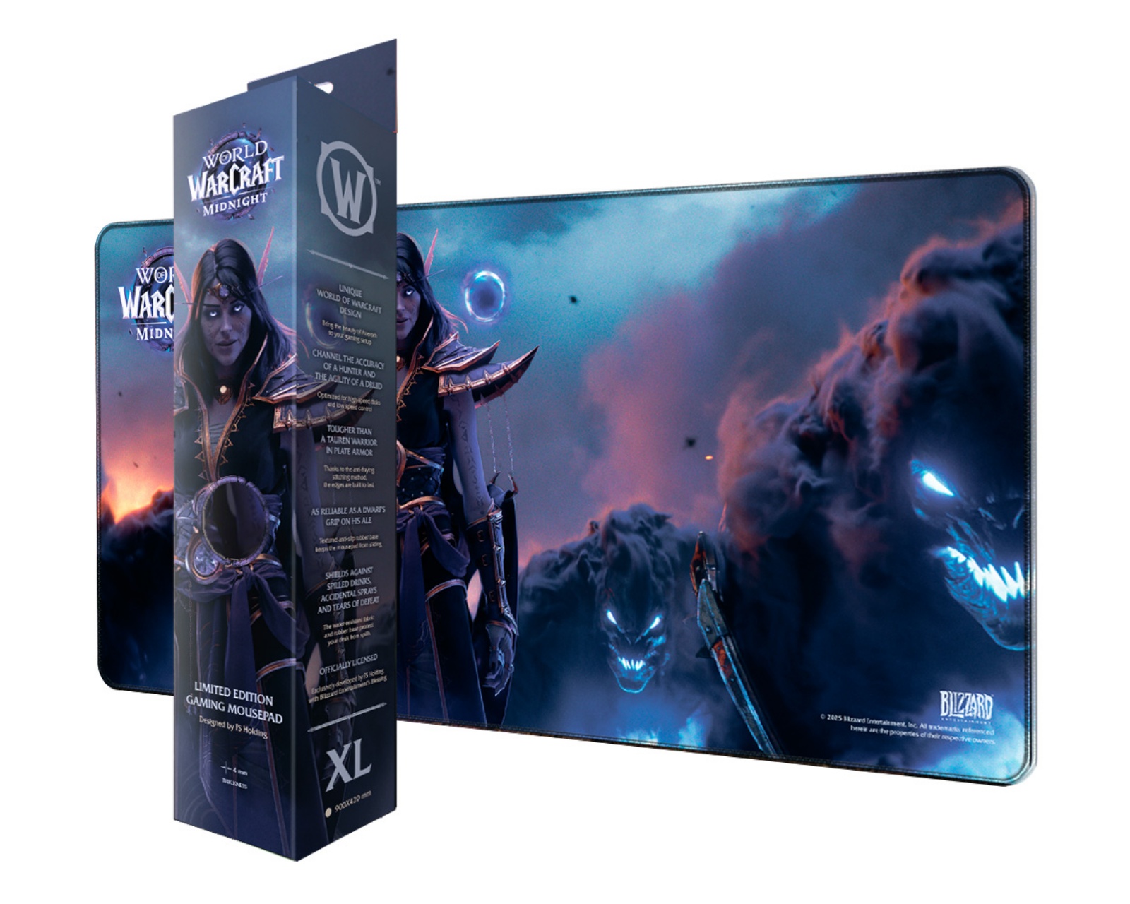 World Of Warcraft: Midnight Xalatath, Musemåtte - XL er en musemåtte designet til gamere, der søger en kombination af stil og funktion. Med et stort og generøst område giver den tilstrækkelig plads til hurtige musebevægelser og komplekse spilsituationer. Musemåtten er designet med en glat overflade for at muliggøre høj præcision og hastighed, hvilket er afgørende for spil, der kræver hurtige reflekser og præcis kontrol.Officielt licenseret af Blizzard Entertainment, fremstillet af materialer af høj kvalitet og med autentisk kunstværk fra World of Warcraft: Midnight.