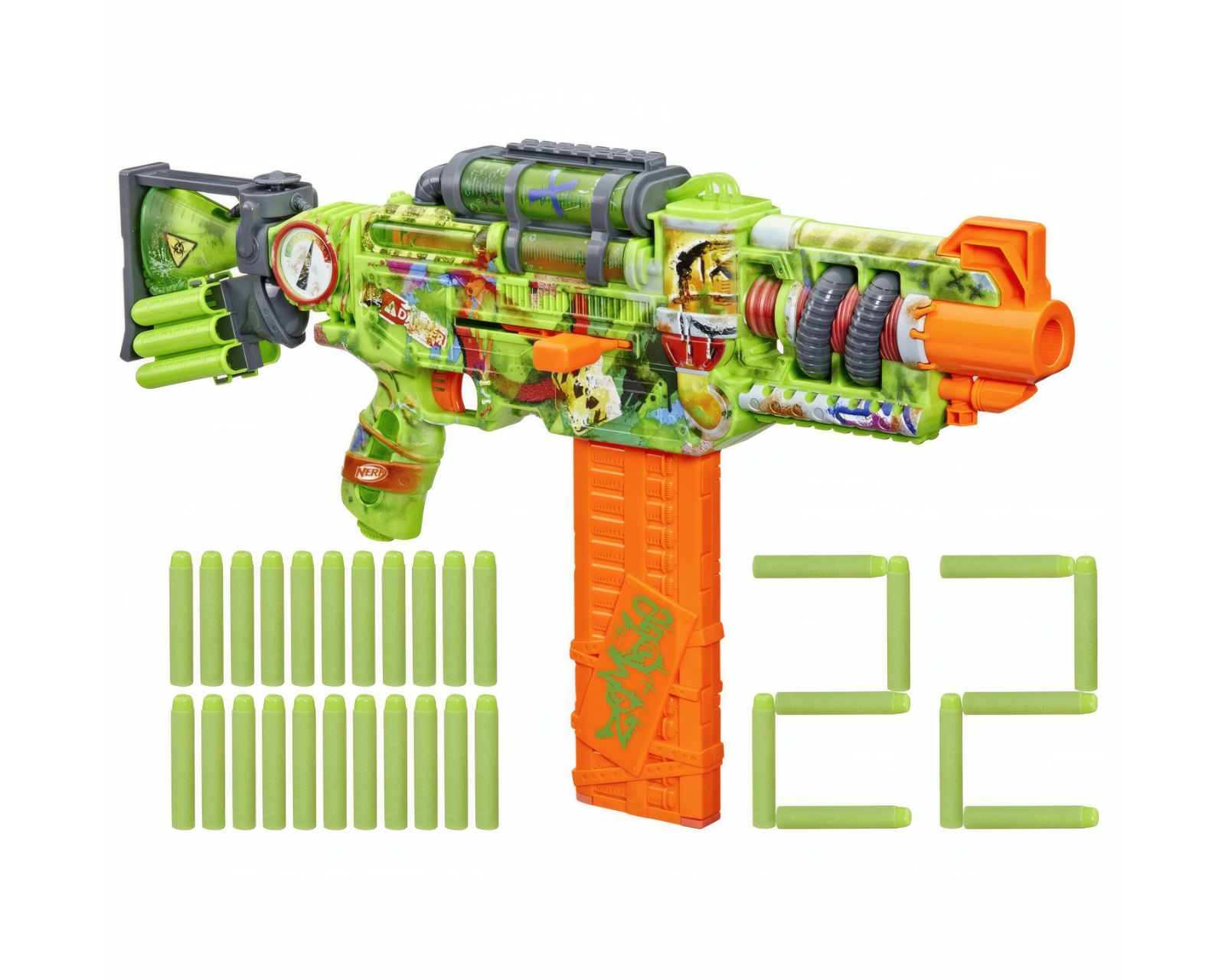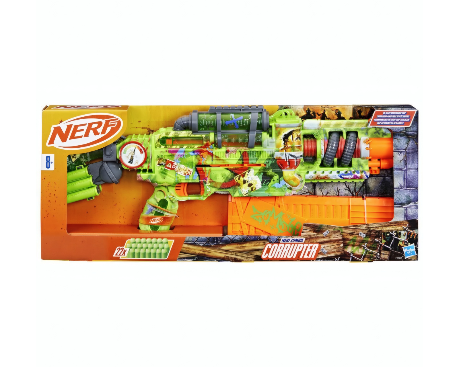 Zombie Corrupter dartblaster er en nerf-blaster fra Nerf med livlige graffitimotiver, beregnet til leg med zombietema. Blasteren har et aftageligt magasin, der rummer 18 dartpile og en praktisk opbevaring til 6 dartpile ombord. Den har et unikt design, der efterligner et våben fremstillet af zombiekæmpere og er egnet til brugere fra 8 år og op.Denne blaster har en stærk byggekvalitet og funktionalitet, inklusive to taktiske skinner, der øger dens anvendelsesmuligheder. Udstyret med 22 medfølgende skumdartpile, er den tilpasset både indendørs- og udendørsleg. Konstruktionen kræver ingen batterier og anbefaler brug af beskyttelsesbriller for sikkerhed, selvom disse ikke er inkluderet i pakken. Det er vigtigt at bemærke, at man ikke må sigte blasteren mod øjne eller ansigt, og at kun officielle Nerf-pile må anvendes for at opretholde sikkerhedsstandarderne.