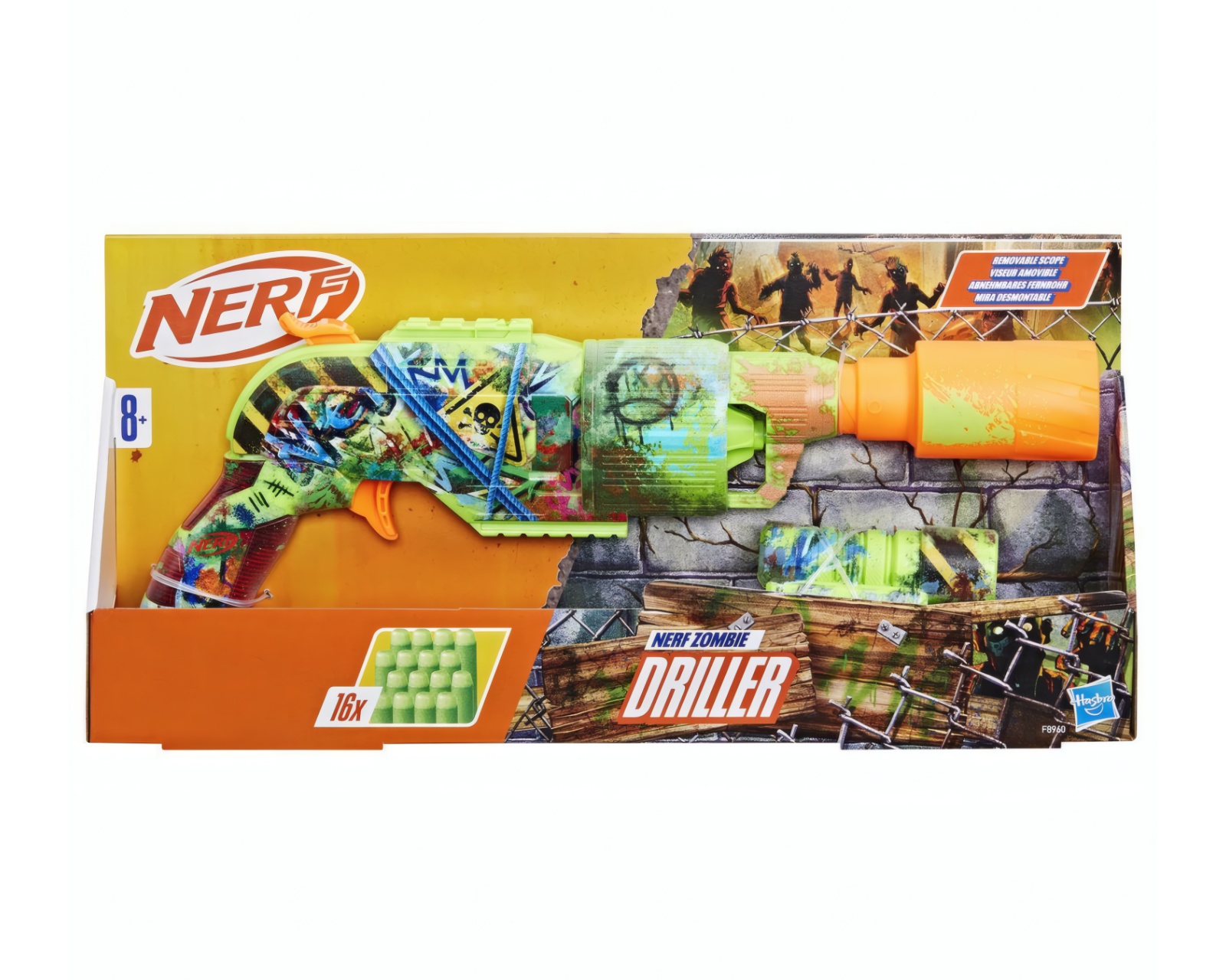 Zombie Driller er en dartblaster fra Nerf med et unikt zombieinspireret design. Med en kapacitet på 5 dartpile i roterende cylinder tilbyder den enkel og hurtig genopladning. Den inkluderer også 16 Nerf Elite-dartpile og et aftageligt sigte for bedre præcision under brug. Produktet er egnet til børn fra 8 år og op og passer til en række forskellige aktiviteter, især i forbindelse med zombietema.Blasteren er fremstillet af holdbart plastmateriale, hvilket giver en robust byggekvalitet. Det særlige graffitidesign er udviklet for at efterligne en boremaskine, der bruges i kampe mod zombier. Blasterens cylinder tillader hurtig affyring og gør den effektiv til leg. Ingen elektrisk drift er nødvendig, og den fungerer bedst med officielle Nerf-dartpile for at sikre en sikker og kontrolleret brug. Derudover anbefales beskyttelsesbriller for sikkerhed, da blasteren ikke skal rettes mod øjne eller ansigt.