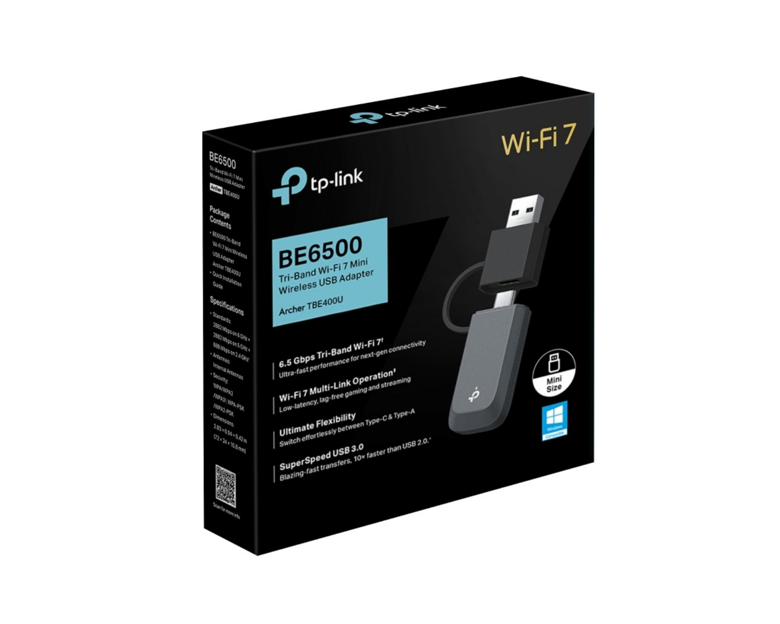 Archer TBE400U BE6500 Tri-Band Wi-Fi 7 Mini er en trådløs USB-adapter fra TP-Link, som kombinerer høj ydeevne med avanceret teknologi. Den er designet til at tilbyde en glat og kraftfuld trådløs forbindelse med hastigheder op til 2882 Mbps på både 6 GHz og 5 GHz bånd, mens 2.4 GHz-båndet leverer 688 Mbps. Adapterens støtte for Wi-Fi 7 sammen med Multi-Link Operation sikrer reduceret latenstid og en stabil oplevelse for gaming og streaming.Archer TBE400U er designet med både USB-C og USB-A porte, hvilket giver brugere fleksibilitet til at tilslutte en række forskellige enheder uden at skulle bruge ekstra adaptere. Med SuperSpeed USB 3.0 får brugere op til 10 gange hurtigere overførselshastigheder sammenlignet med USB 2.0, hvilket gør den perfekt til store filer og hurtigere forbindelser. Den nyeste WPA3-sikkerhed tilbyder ekstra beskyttelse mod uautoriseret adgang og sikrer, at dine data er beskyttet. Installation er enkel og kræver ingen CD, hvilket gør, at den er plug-and-play-kompatibel med Windows 10 og 11.