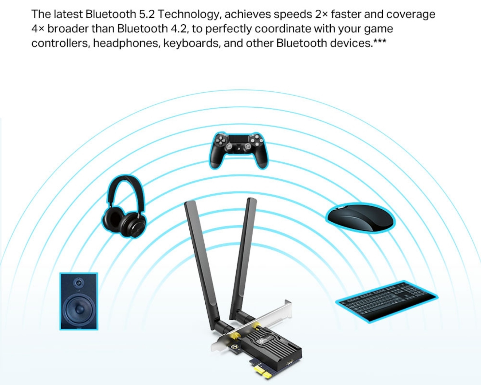Archer TX20E er en PCIe-adapter fra TP-Link, som tilbyder støtte for Wi-Fi 6 og Bluetooth 5.2. Denne enhed giver enestående hastigheder med op til 1201 Mbps på 5 GHz og 574 Mbps på 2.4 GHz, hvilket bryder gigabit-barrieren. Med to eksterne højtydende antenner sikres en bredere signal dækning i hele hjemmet, hvilket bidrager til øget stabilitet og forbindelse.Archer TX20E er opbygget til at levere høj ydeevne og har støtte for de nyeste tekniske standarder, inklusive 802.11ax, ac, a, b, g og n. Bluetooth 5.2-teknologien muliggør hurtigere hastigheder og øger dækningen med op til fire gange sammenlignet med forgående versioner. Derudover giver WPA3 sikkerhedsprotokol forbedret beskyttelse for personlig adgangskodesikkerhed. Adapterens design er også i overensstemmelse med at være bagudkompatibel, hvilket gør den anvendelig for forskellige netværkskonfigurationer.