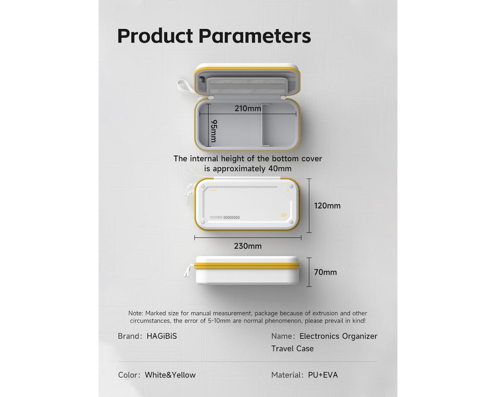 Hagibis Elektronisk Organizer er en opbevaringstaske fra Hagibis, der kombinerer praktisk design med sikkerhed for elektroniske tilbehør. Den partitionerede opbevaring gør det nemt at organisere harddiske, opladere, datakabler, powerbanks, USB-nøgler og andre digitale produkter. Tasken er ideel til den, der rejser og har brug for at holde sine dele samlet og beskyttede under transport.Tasken har en hård EVA-skal, der beskytter mod fald, ridser, stød, sprøjt og støv. Indersiden har en blød foring for at forhindre skader på enhederne. Grovdelen i designet sikrer, at tilbehøret holdes adskilt og forhindrer, at de skraber mod hinanden. Den ydre del er lavet af PU-læder, hvilket giver en overlegen vandtæthed sammenlignet med traditionelle materialer. Desuden har tasken en unik lynlås i høj kvalitet fra YKK, som minimerer risikoen for ridser på værdifulde enheder og garanterer, at små genstande ikke falder ud.
