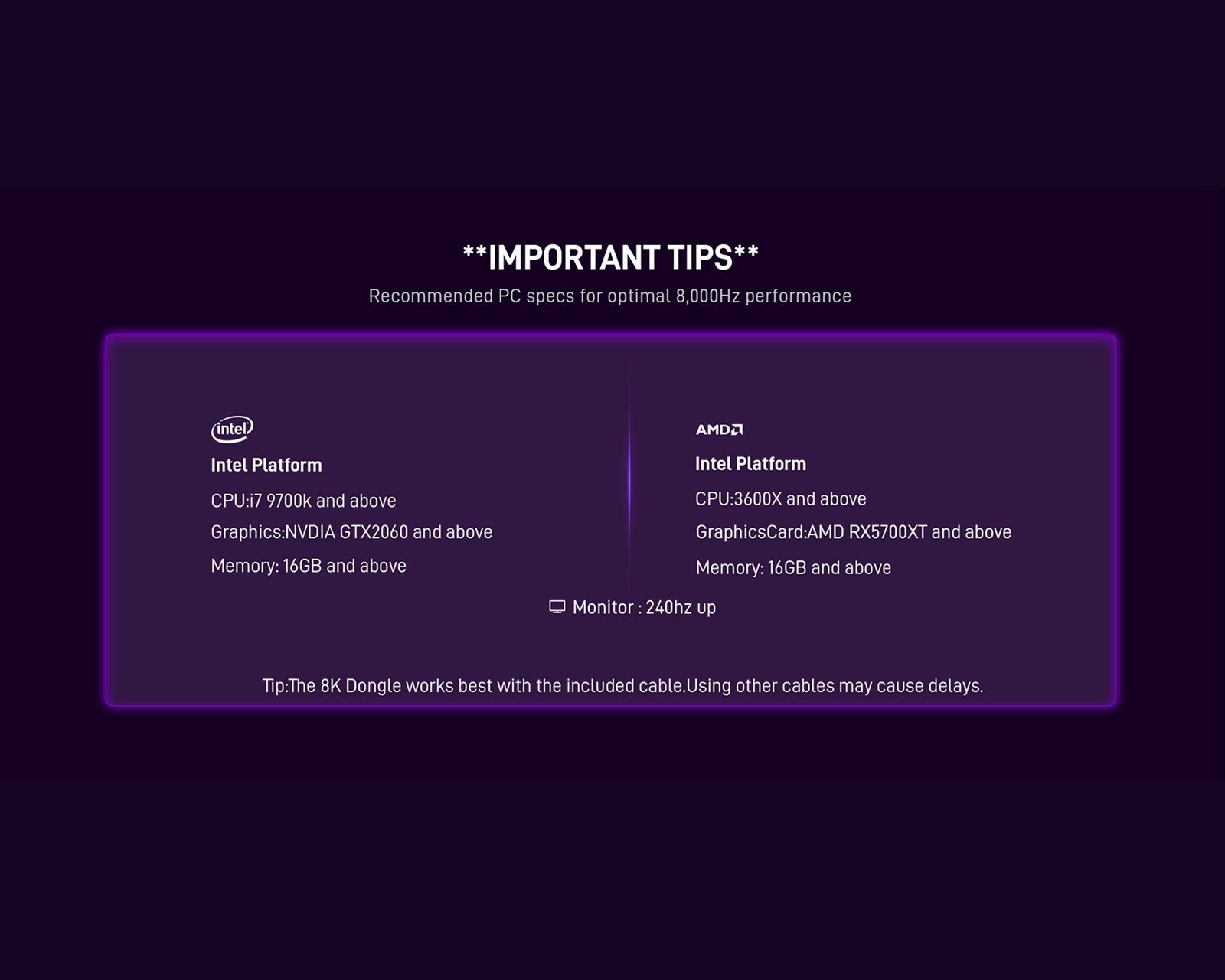 8K II Dongle fra LAMZU, som muliggør en opdateringsfrekvens på op til 8000 Hz, hvilket giver en hurtig og responsiv oplevelse. Den tilbyder en betydelig stigning i datatransmission, hvilket er særligt fordelagtigt for spil med høje opdateringsfrekvenser. Donglen er designet til at give et forspring i FPS- og MOB-spil ved at levere mikrosekundsniveauer af svartid.Enheden gør det muligt for brugere at nemt tilslutte med en webbrowser-drevet, en-knaps konfiguration. Ved at bruge det medfølgende kabel maksimerer den ydeevnen og giver en polling rate på 8000 Hz.