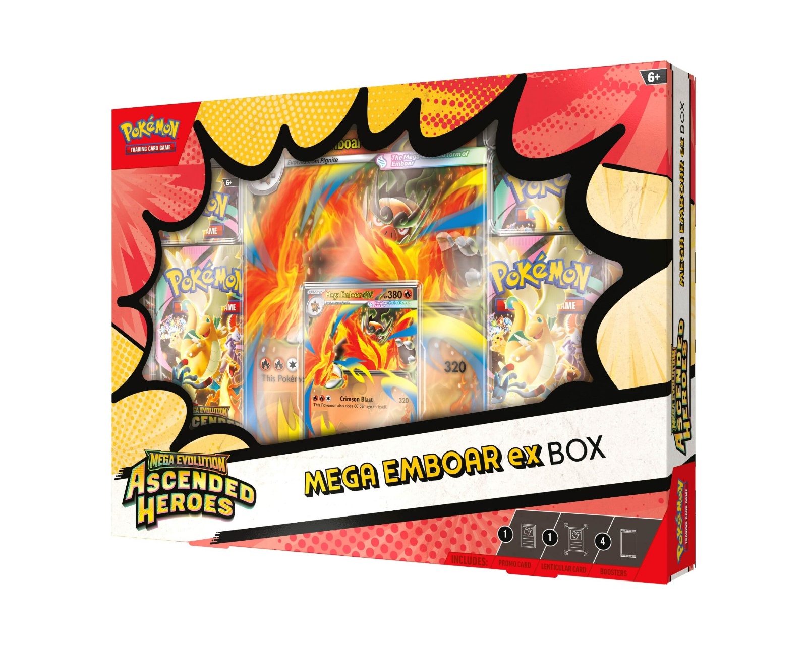 Mega Evolution-Ascended Heroes MEGA ex Box er et samlerprodukt fra Pokémon, som inkluderer spændende indhold for både spillere og samlere. Boxen indeholder et foil promo-kort med Mega Emboar ex eller Mega Feraligatr ex og et oversized lentikulært kort, hvilket giver en visuel dimension til samlingen. Derudover indgår der fire boosterpakker fra Ascended Heroes, hvilket muliggør jagt på særlige kort og en kode til Pokémon Trading Card Game Live.Bygget til at imødekomme samleres og spilleres behov tilbyder Mega Evolution-Ascended Heroes MEGA ex Box en kombination af kraft og visuel brillans. Promo-kortet med Mega Emboar ex byder på Crimson Blast-angrebet, kendt for sin evne til at påvirke kampens struktur. Det lækre lentikulære kort giver en dynamisk 3D-oplevelse, mens boosterpakkerne giver muligheder for at udvide samlingen med flere kort, herunder uslåelige legendariske Pokémon.