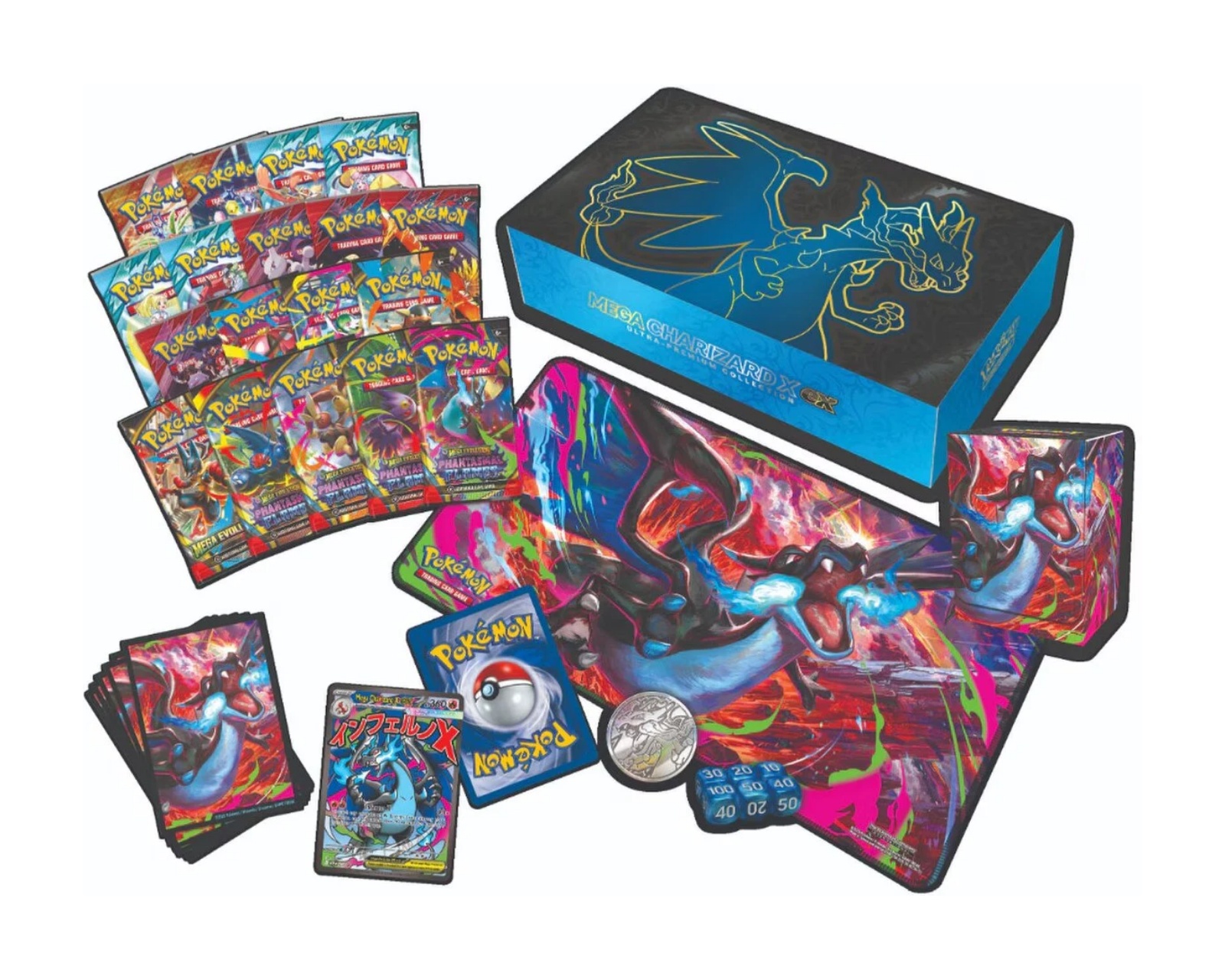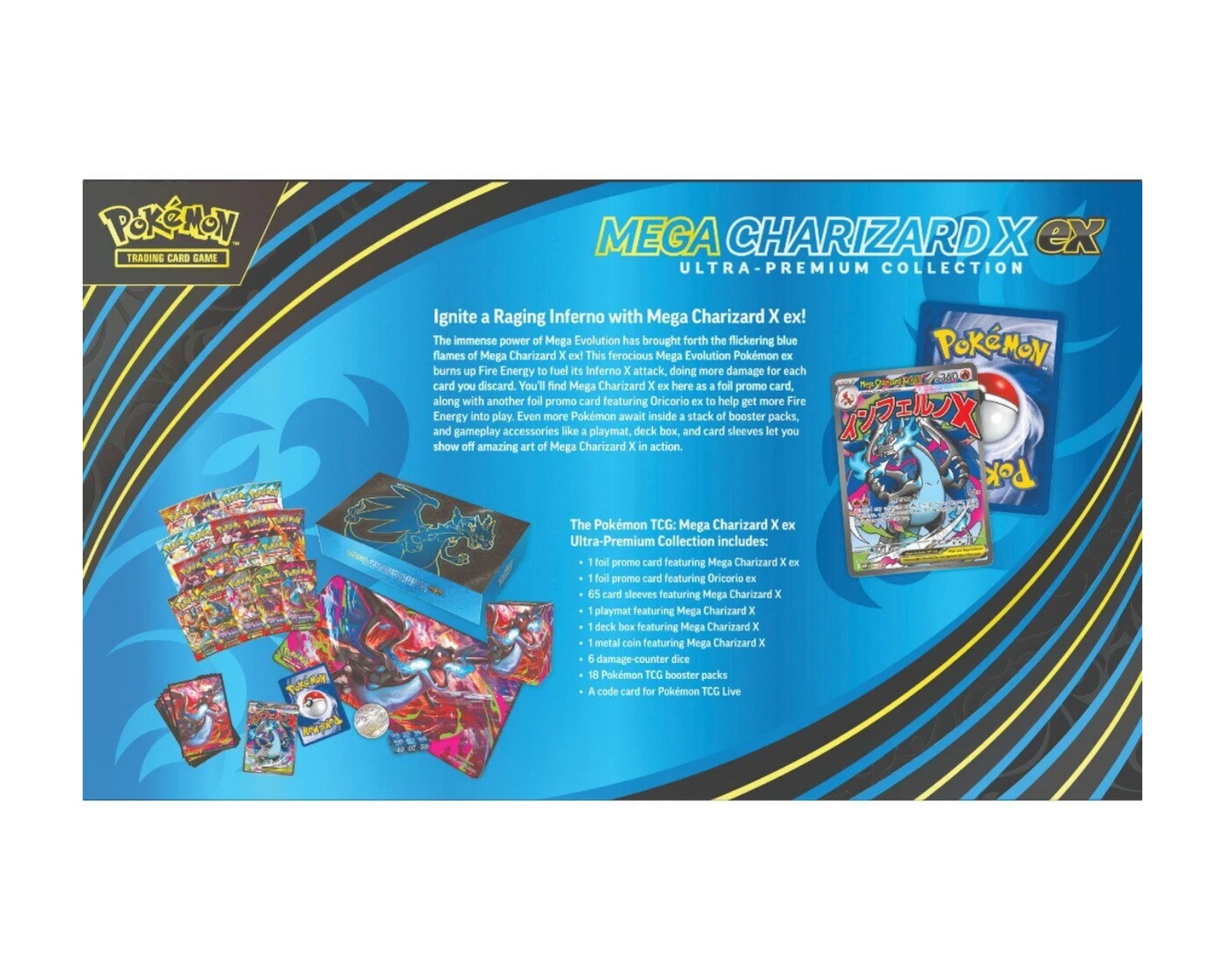 Mega Charizard X ex Ultra-Premium Collection er et produkt fra Pokémon, som tilbyder en række specialkort og tilbehør til samlekortspil. Samlingen indeholder et foil promo-kort med Mega Charizard X ex og et foil promo-kort med Oricorio ex samt forskellige spilletilbehør. Inholdet i boksen inkluderer 65 kortbeskyttere prydet med illustrationer af Mega Charizard X, et spillemåtte med samme motiv, en kortæske, en metalmønt og seks damage-counter terninger.Derudover medfølger 18 booster-pakker, hvilket giver mulighed for at udvide samlingen. Kvaliteten af kortene er standard for Pokémon-kort, og alle kort er designet til at beskytte spilleren og give en unik spilleoplevelse. Samlingen er udformet til at støtte både samling og spil, hvilket gør den ideel for både nybegyndere og erfarne gamere.