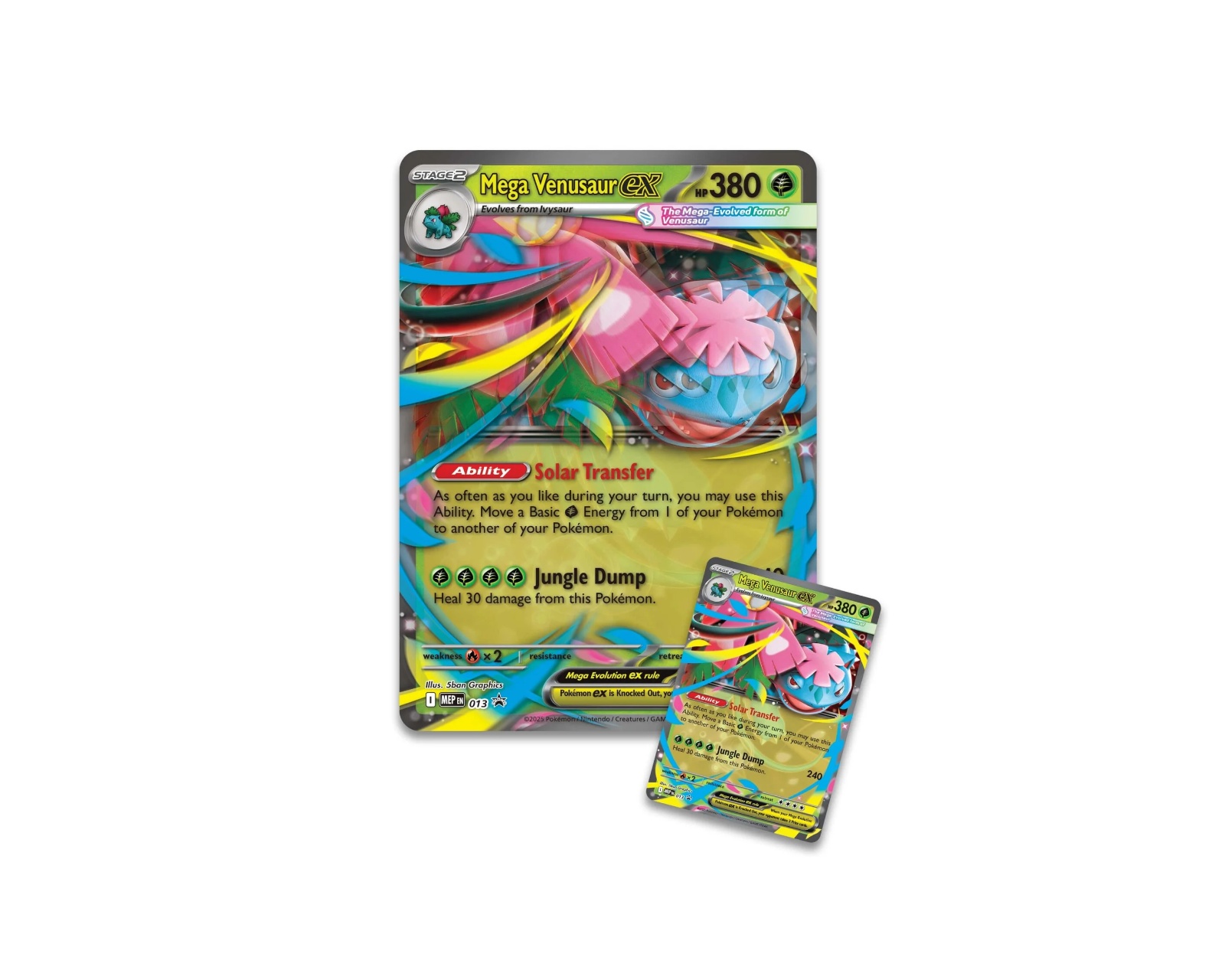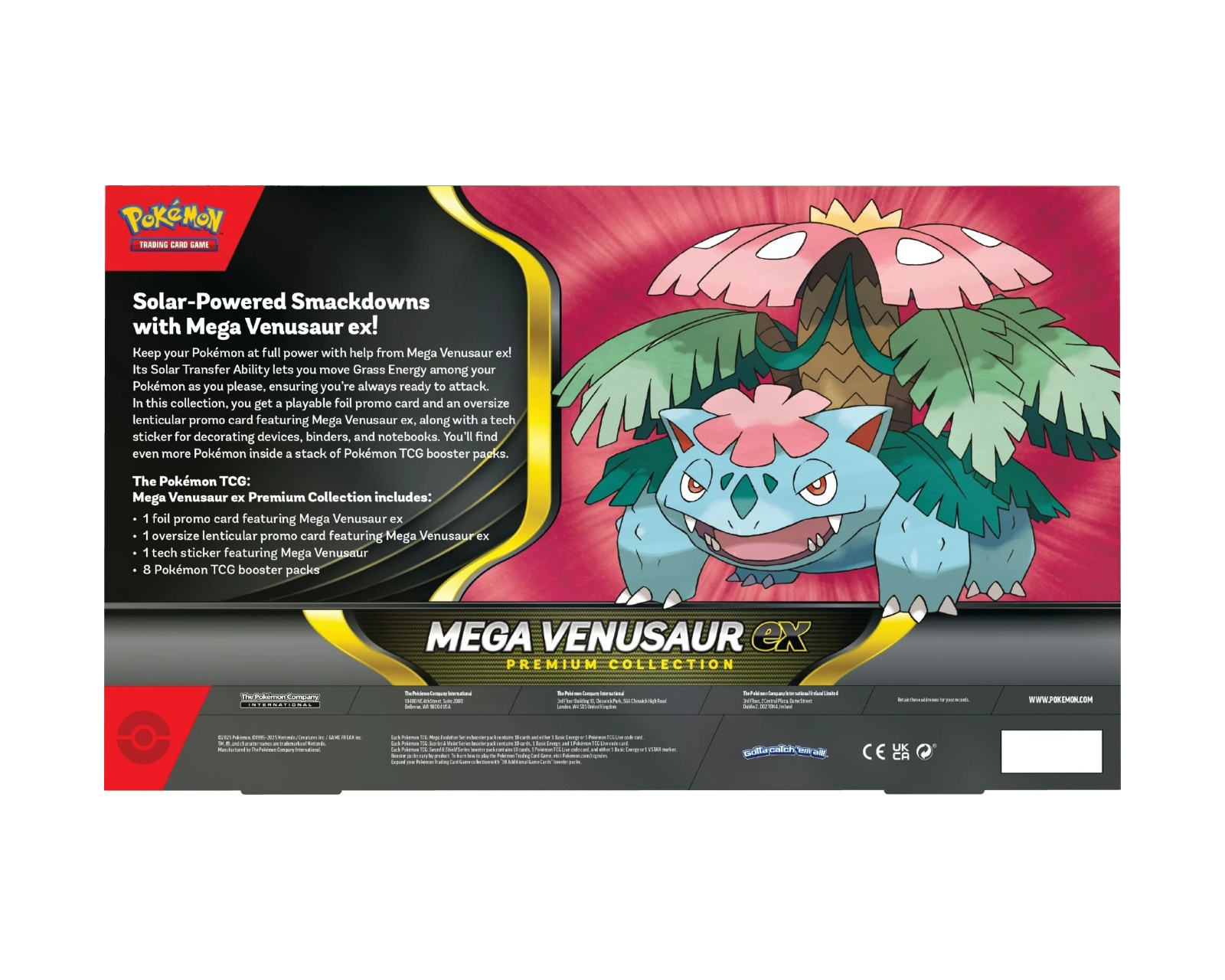 Mega Venusaur ex Premium Collection er en samling produkter fra Pokémon, som indeholder en kombination af spillbare kort og samlingsobjekter. Samlingen inkluderer et foil promo kort, der viser Mega Venusaur ex, et stort lentikulært promo kort af den samme figur samt et teknisk klistermærke til dekoration. Denne pakke er ideel for spillere, der er interesserede i at forstærke deres kortlæger med kraftfulde kort og samle unikke genstande. Der er også en stak af Pokémon TCG booster pakker for at udvide samlingen.Oversigt