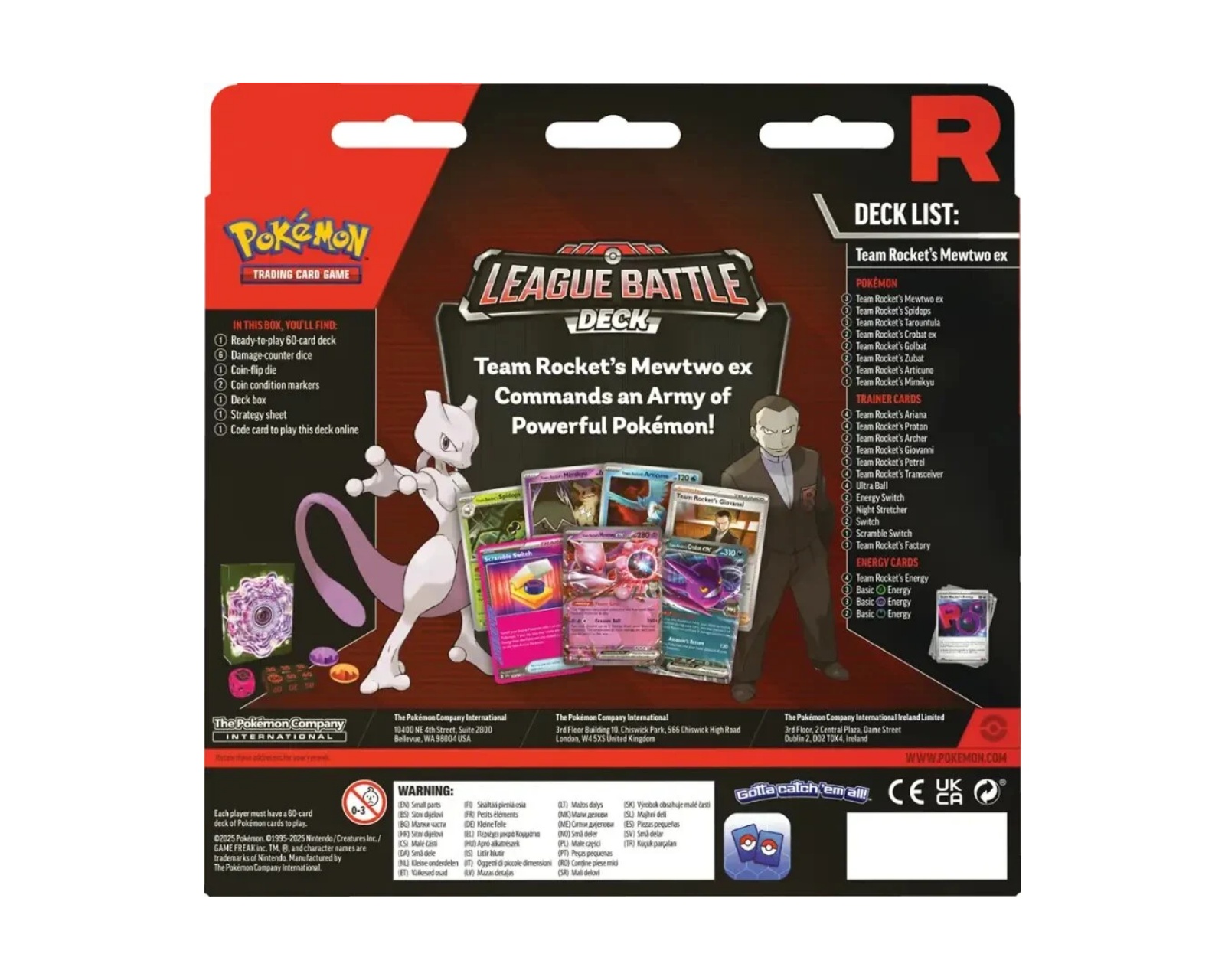 Team Rockets Mewtwo ex League Battle Deck er et samlekortspil fra Pokémon, som inkluderer et spill klart 60-korts dæk, designet til hurtig og nem spil. I pakken medfølger seks skade-counters terninger og en møntkast terning, hvilket letter spillets mekanik. Produktrubriken henvender sig til gamere og entusiaster af samlekortspil, og alle komponenter er designet til at give en komplet spilleoplevelse.Lådens indhold omfatter også to mønttilstandsmarkører og en specialdesignet kortlåda til sikkert opbevaring af kortene. Derudover medfølger et strategiblade, som giver vejledning til hvordan man spiller dækket, samt et kodekort, som muliggør spil online med det specifikke dæk, der er inkluderet. Hver komponent er designet til optimalt spil, hvilket gør det nemt for gamere at begynde at spille med det samme.