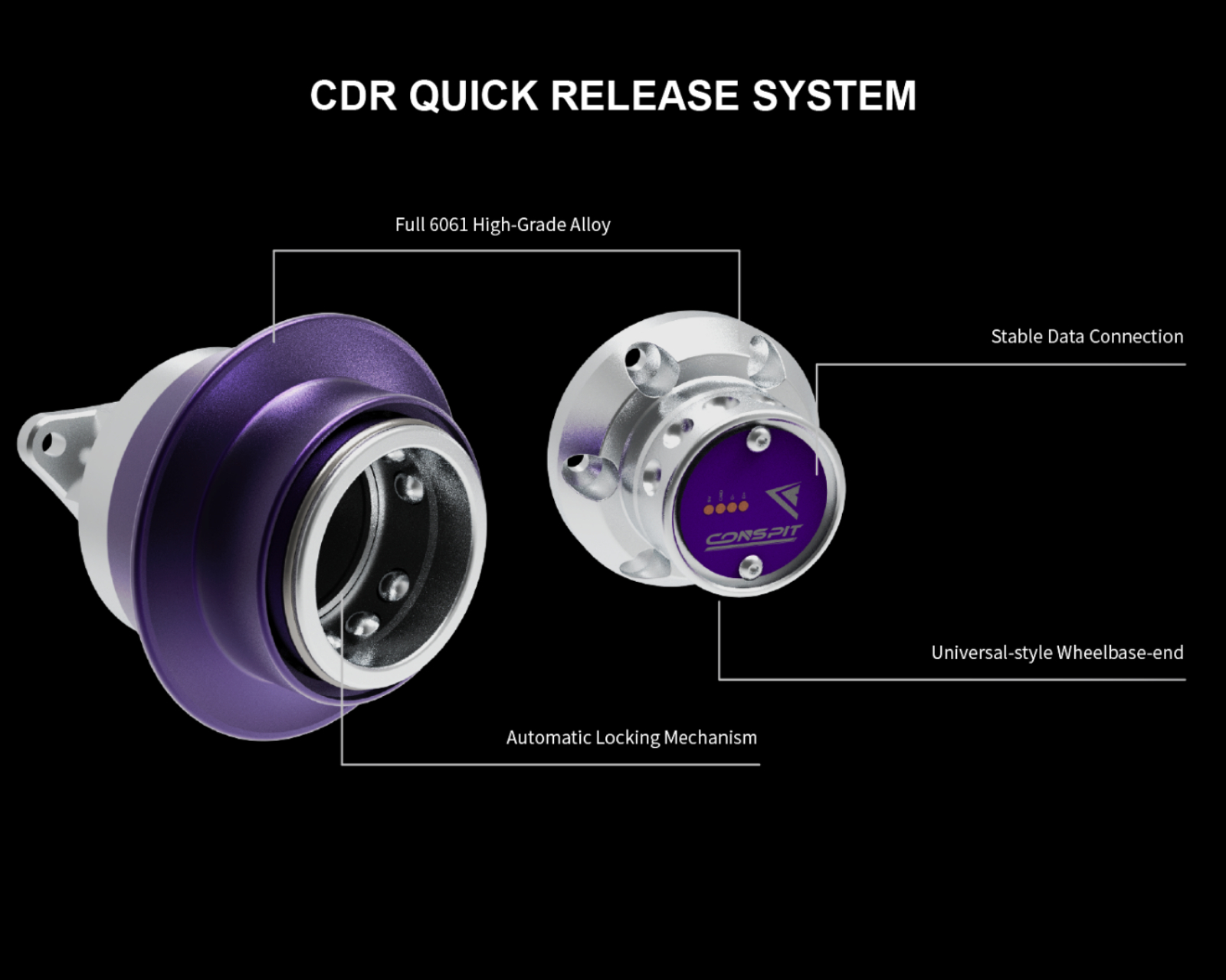 CDR Quick Release er et produkt fra Conspit, specifikt designet til sim-racing. Systemet muliggør hurtig montering og demontering af rattet, hvilket letter for brugere, der ønsker at skifte mellem forskellige rat. Det har et universelt design og er mekanisk kompatibelt med de fleste hjulbaser og rat, der anvendes inden for branchen. CDR Quick Release har til formål at forbedre brugeroplevelsen i intense racing-situationer.Systemet er udstyret med en automatisk låsefunktion, der forenkler monteringen af rattet. Ved at trække op i låseringen er der ikke behov for manuel justering, hvilket gør brugen enkel og hurtig. Ved demontering trækkes ringen, og rattet løsner automatisk. Desuden tilbyder systemet pålidelig signalstabilitet takket være integrerede fjædkontakter, hvilket giver en stabil elektrisk forbindelse, der klarer miljøer udsat for elektromagnetisk interferens. Denne stabilitet overgår traditionelle trådløse løsninger.