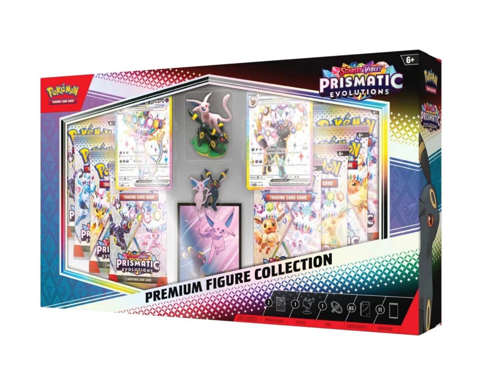 Scarlet & Violet 8.5: Prismatic Evolutions Premium Figurkollektion er en samling fra Pokémon, som indeholder to unikke etched foil promo kort: Espeon ex og Umbreon ex. Kollektionen tilbyder også en figur af Espeon og Umbreon, en samlerpin med det samme motiv, og 65 kortslirer prydet med illustrationer af disse Pokémon. Desuden inkluderer samlingen 11 boosterpakker fra Scarlet & Violet-Prismatic Evolutions-udvidelsen, hvilket gør den til en interessant hjælp til gamere, der samler kort. Et kodekort til Pokémon TCG Live indgår også for at give adgang til det digitale spil.Samlingens materialer har høj byggekvalitet, og kortene er designet til at være holdbare og samlervenlige. Forpakningen er displayvenlig, hvilket gør det nemt at vise samlingen. Hver boosterpakke indeholder 10 kort samt 1 Basic Energy, hvilket bidrager til spillets strategiske dybde og variation. Kortens design og tekstur sikrer, at de skiller sig ud både visuelt og hvad angår spelfunktionalitet.