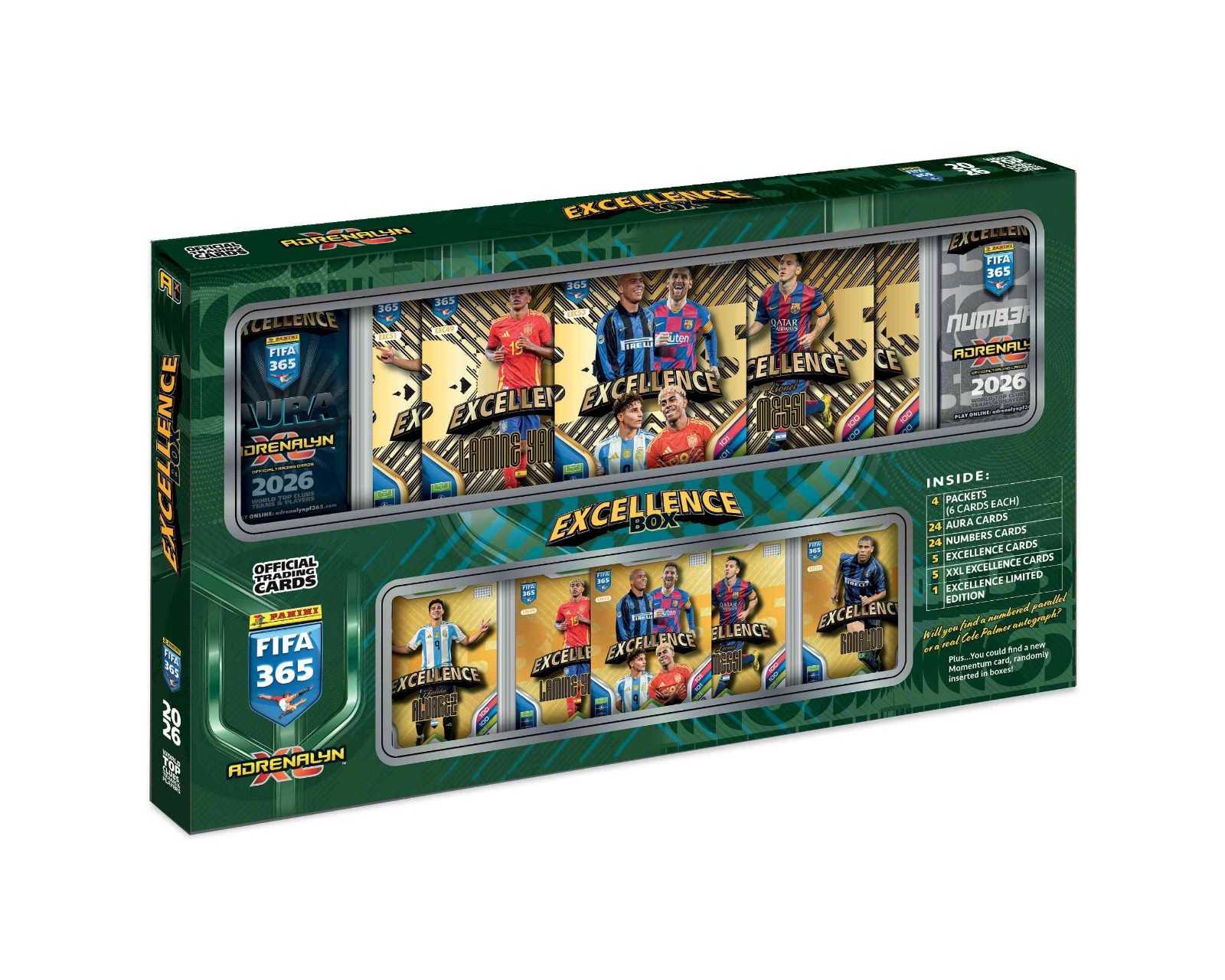 FIFA 365 Adrenalyn XL 2026 Excellence Box er en samlerboks fra Panini, som indeholder kort relateret til fodbold, herunder forskellige kendisser og hold. Denne boks er designet til samlere og fodboldfans, der ønsker at udvide deres kortsamlinger med en blanding af specialkort og almindelige kort. Hovedkomponenterne inkluderer 82 kort, der er fordelt i 4 eksklusive boosterpakker med Aura-kort, 4 eksklusive boosterpakker med Numbers-kort, 4 almindelige boosterpakker og flere Excellence-kort.Boksen tilbyder flere specialmaterialer og underkategorier, som øger samleværdien, herunder Limited Edition-kort, parallelle kort og kort med ægte autograf. Kortene er også numrerede for øget unikhed. Hver boosterpakke indeholder 6 kort, hvilket i alt giver 24 Aura-kort og 24 Numbers-kort. Derudover indgår 5 eksklusive Excellence-kort og 5 XXL Excellence-kort for dem, der søger noget ekstra.