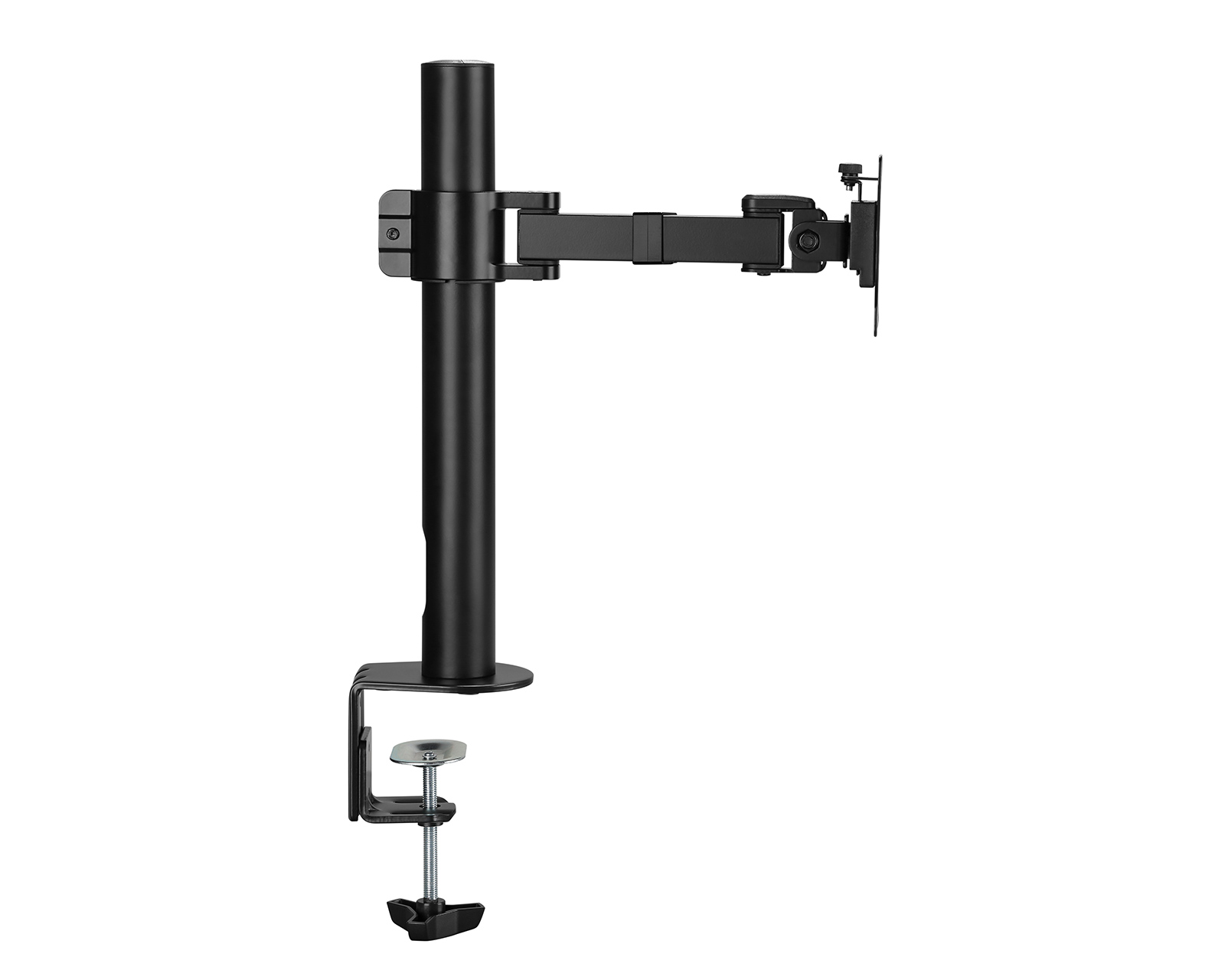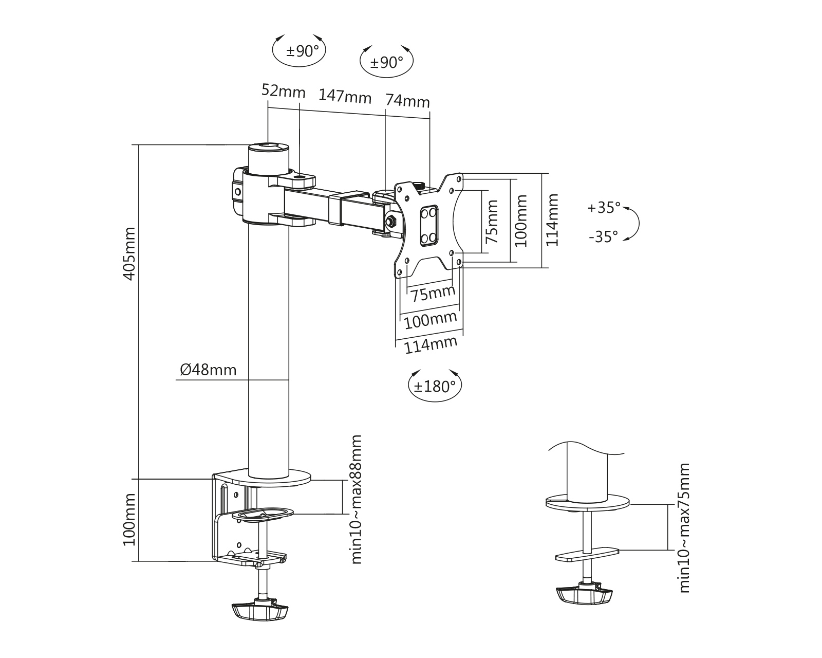 Bordsløsning for computerskærm fra MaxMount er et skærmstativ, der kombinerer effektivitet og funktionalitet. Dette produkt muliggør en ergonomisk placering af skærme mellem 17 og 32 tommer og har en maksimal vægt på 9 kg. Ved at anvende klemmeinstallation frigør det skrivebordsplads og giver ekstra fleksibilitet i arbejdsmiljøet. Stativet er fremstillet af stål, hvilket giver en stabil og holdbar konstruktion.Med kabelhåndtering og justerbare funktioner til hældning (+45° til -45°) samt rotation (+180° til -180°) forbedres brugervenligheden. Den svingbare bevægelsesstruktur har et svingområde på +90° til -90°, hvilket muliggør en glidende tilpasning af skærmpositionen. Stativet har også VESA-beslag med målene 75x75 og 100x100, hvilket garanterer kompatibilitet med de fleste skærme på markedet. 5 års garanti giver ekstra tryghed for brugeren.